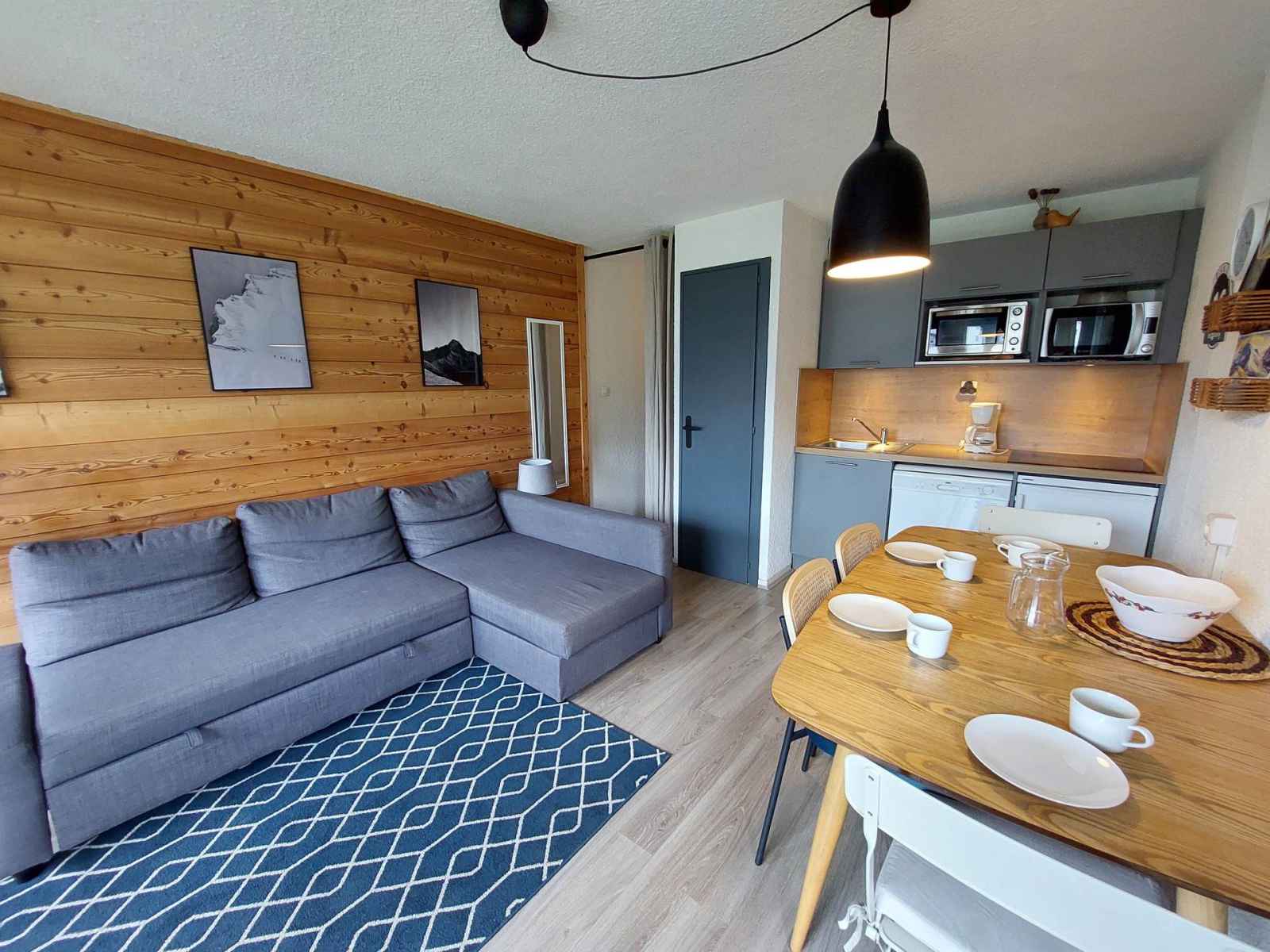 vitrocéramiques, micro-onde, réfrigérateur, lave-vaisselle, mini-four, cafetière, bouilloire, grille-pain, appareil à raclette, appareil à fondu. Couchages : - Séjour : 1 canapé convertible - Chambre : 1 lit double - Coin nuit : 2 lits simples superposés Couchage supérieur déconseillé aux – de 6 ans Le coin nuit est situé dans le couloir, séparé par un rideau. Sanitaires : Salle de bain avec douche italienne WC séparés. Divers : Casier à ski Accès au parking collectif de l'immeuble, place non garantie. Animaux interdits Le linge de lit, le linge de maison, les serviettes, le wifi ainsi que le ménage de fin de séjour ne sont pas inclus (à réserver au plus tard le jour de votre arrivée et sous réserve de disponibilité).