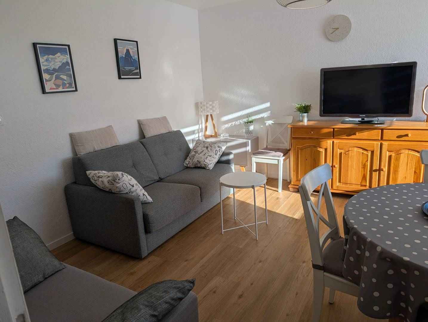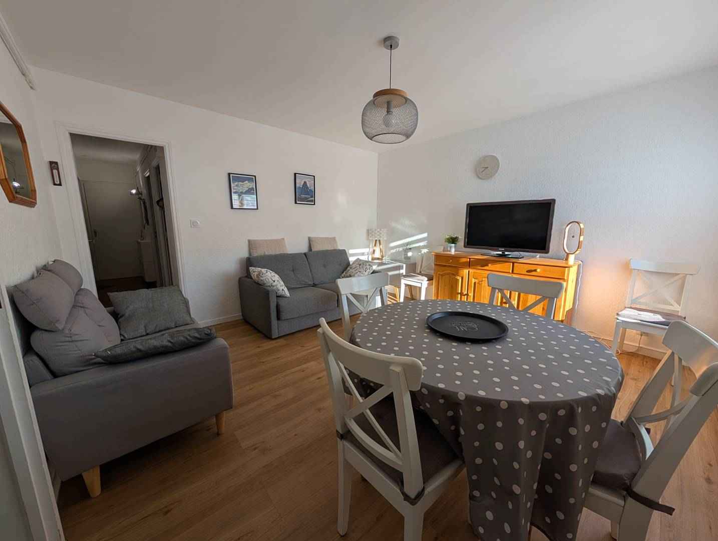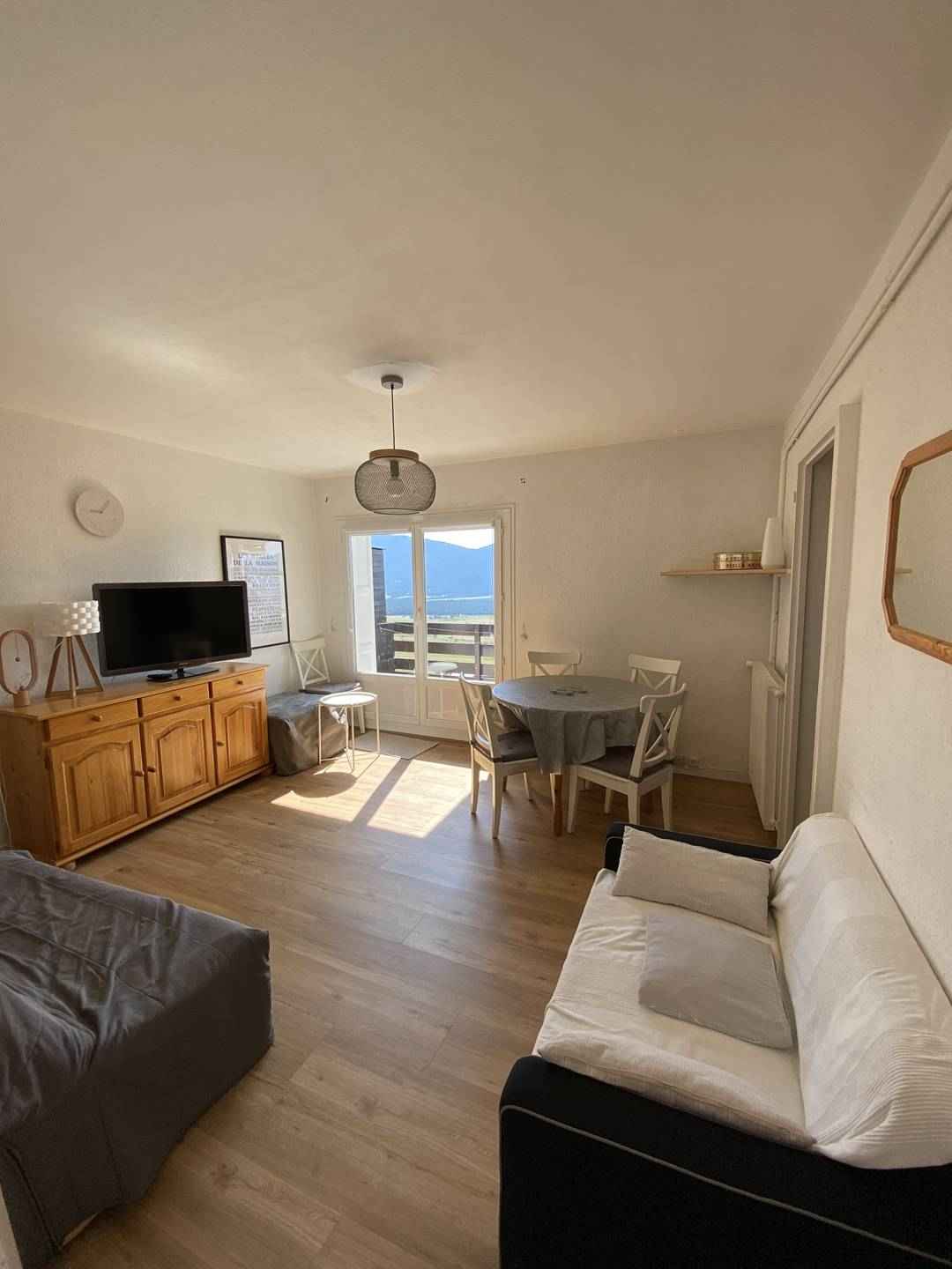 Séjour avec canapé TV coin repas et balcon offrant une vue superbe sur le lac de Matemale et la chaine de montagne
