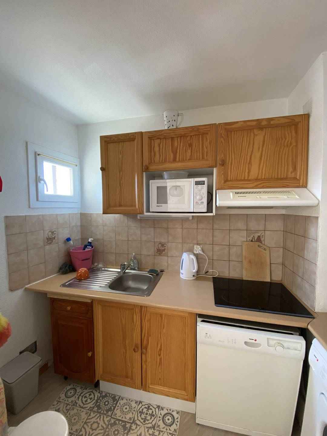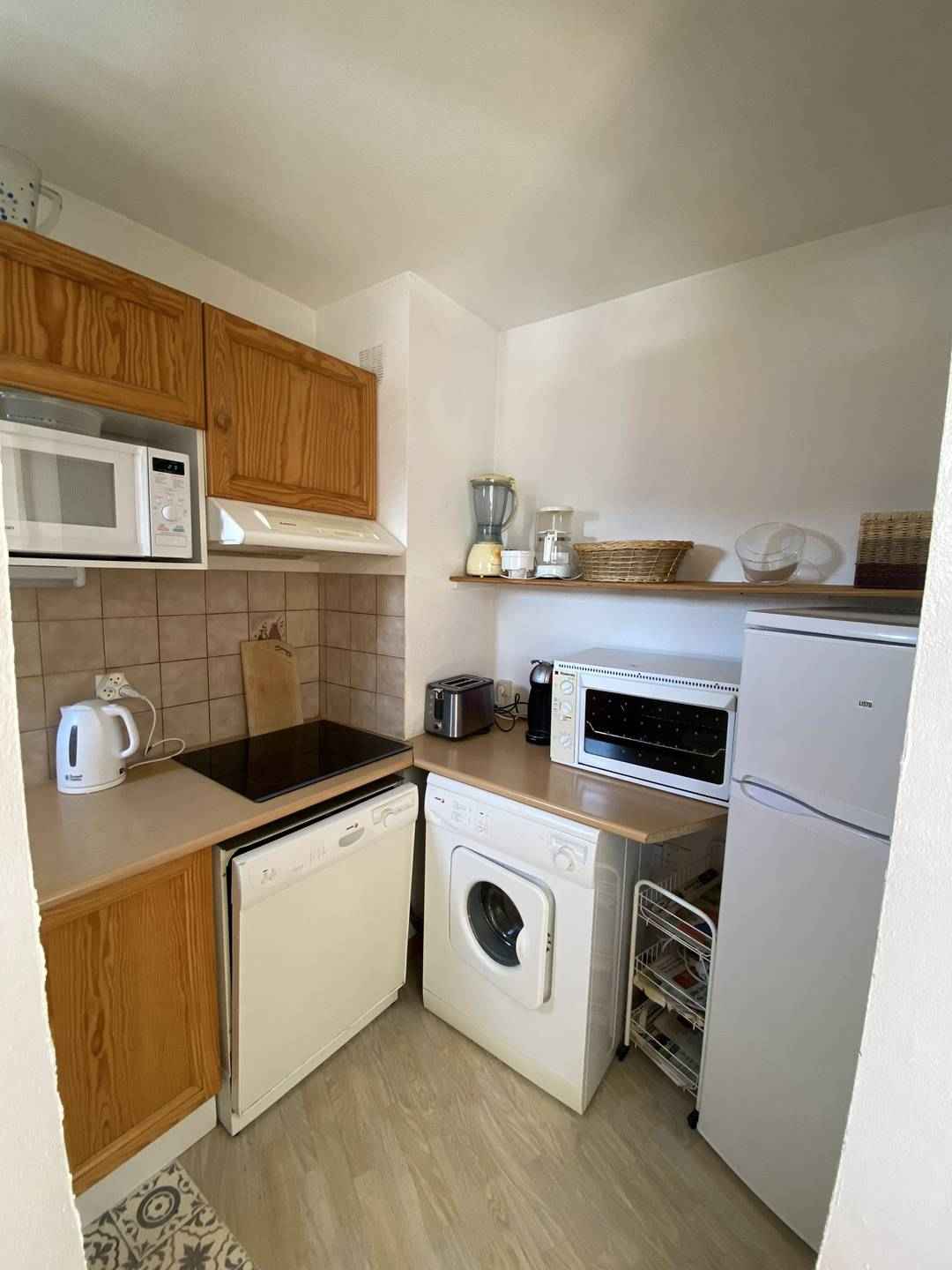 Une petite cuisine équipée d'une plaque de cuisson induction d'un grand réfrigérateur d'un lave vaisselle d'un lave linge d'un four et d'un micro ondes.