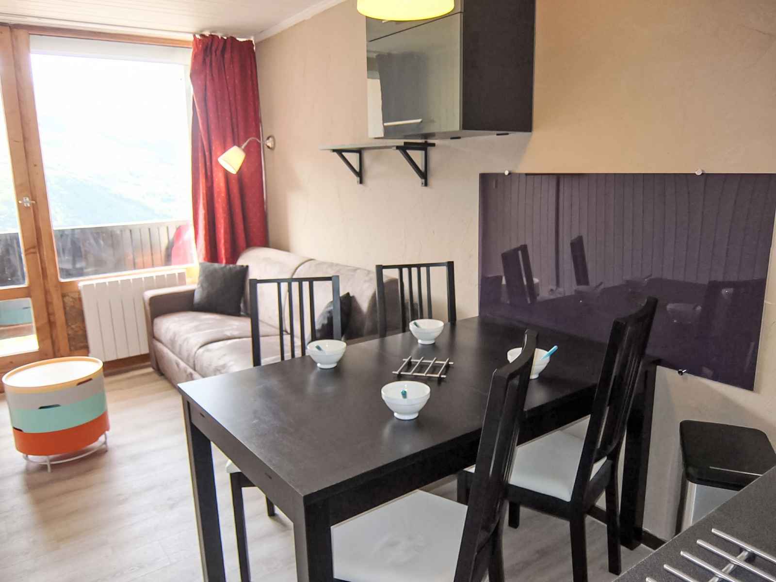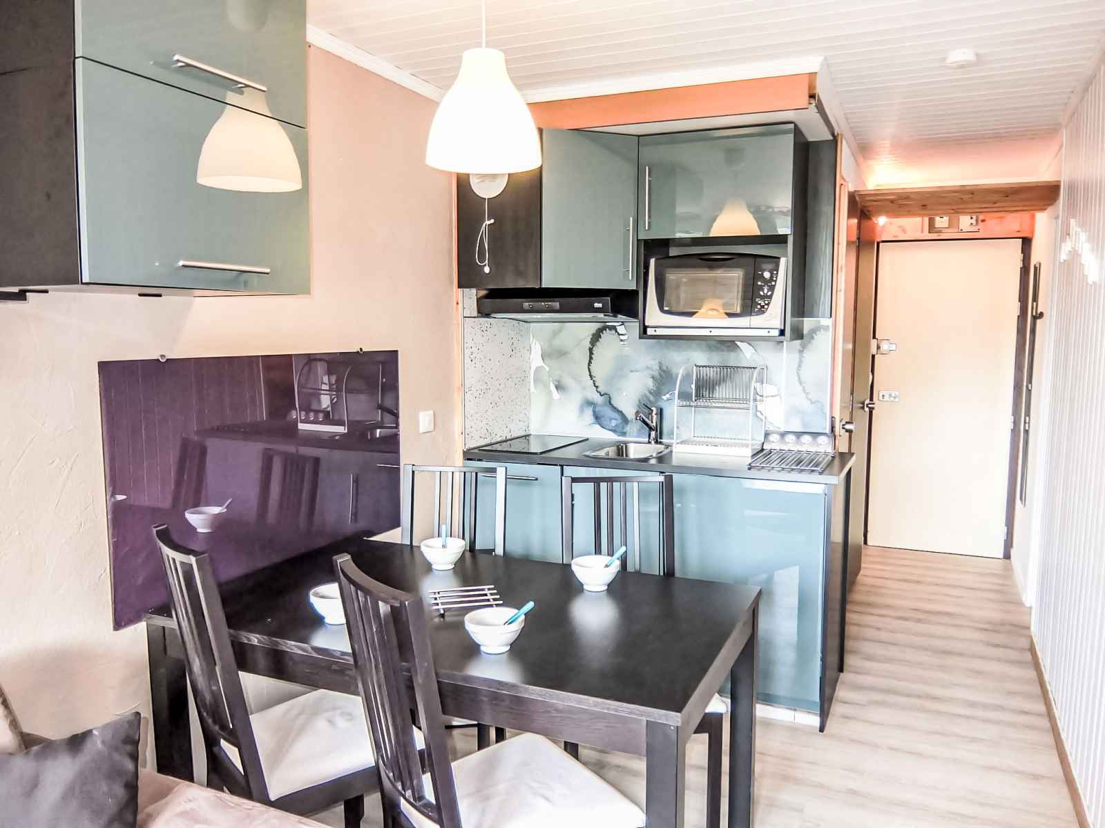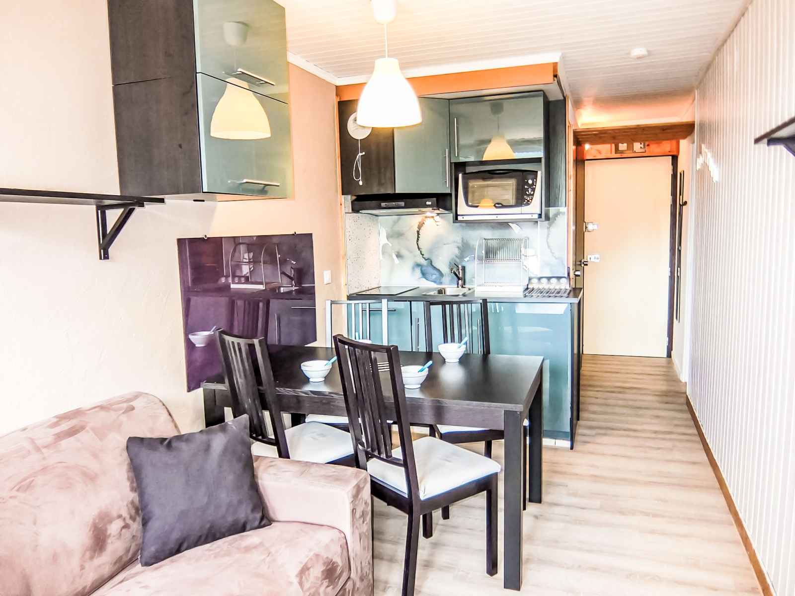 "villaret 604" studio 22 m2 au 6ème étage. rénové, aménagement agréable: séjour/salle à manger avec 1 divan-lit double (160 cm, longueur 190 cm), tv (écran plat). sortie sur le balcon. cabine avec dressing avec 1 x 2 lits superposés (80 cm, longueur 190 cm). coin cuisine (lave-vaisselle, 2 plaques vitrocéramiques, grille-pain,