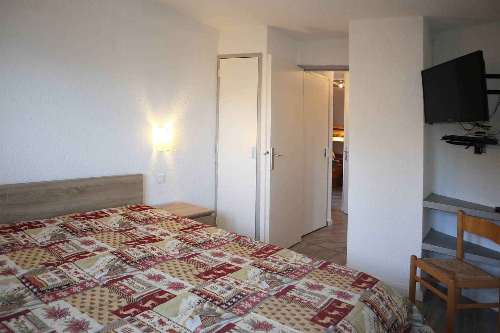 chambre avec 1 lit 2 places, d'une cuisine indépendante et d'une salle de bains et wc séparés. Balcon exposition ouest au 8 ème étage avec ascenseur. Box à skis dans la résidence.