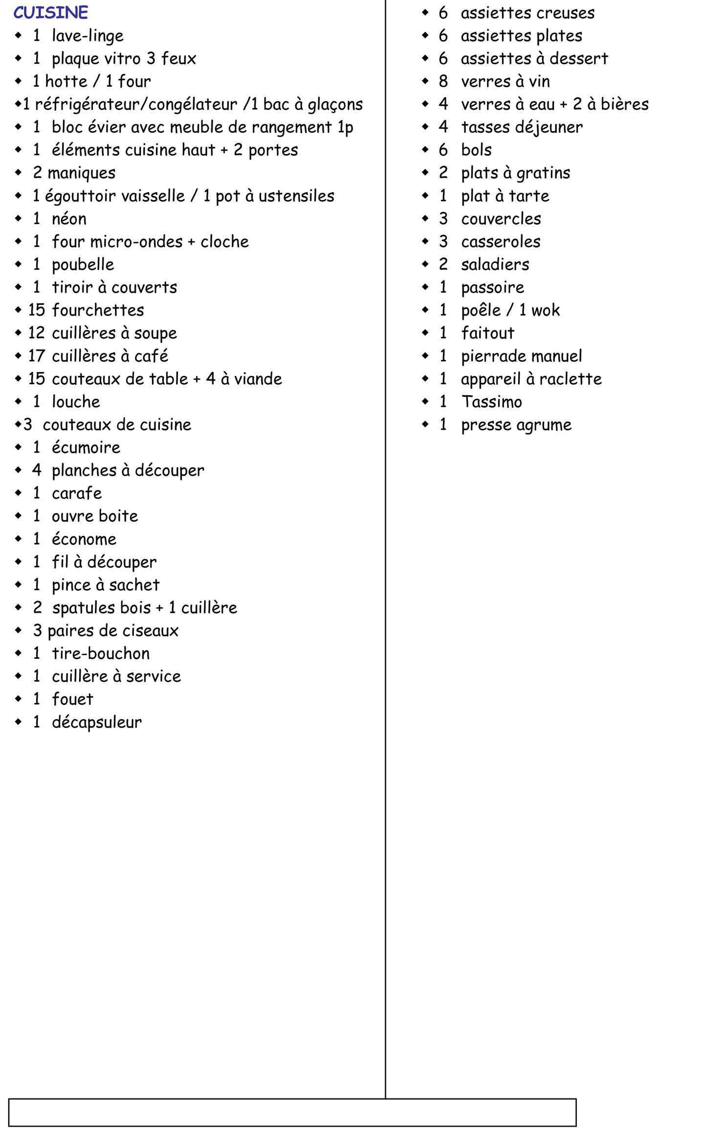 et 1 lit 2 places, cuisine américiaine entièrement rénovée, séjour 1 canapé lit 2 places.