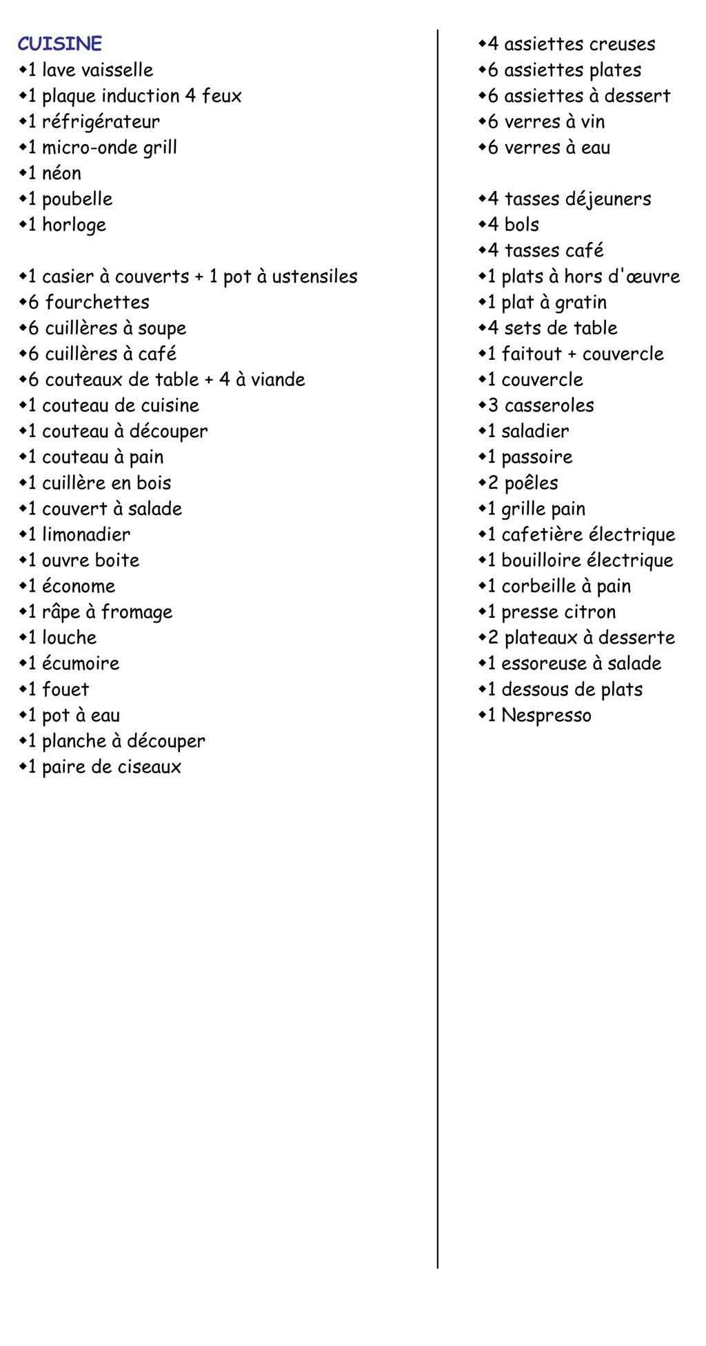 • Equipements : Lave vaisselle, Micro onde, Télévision