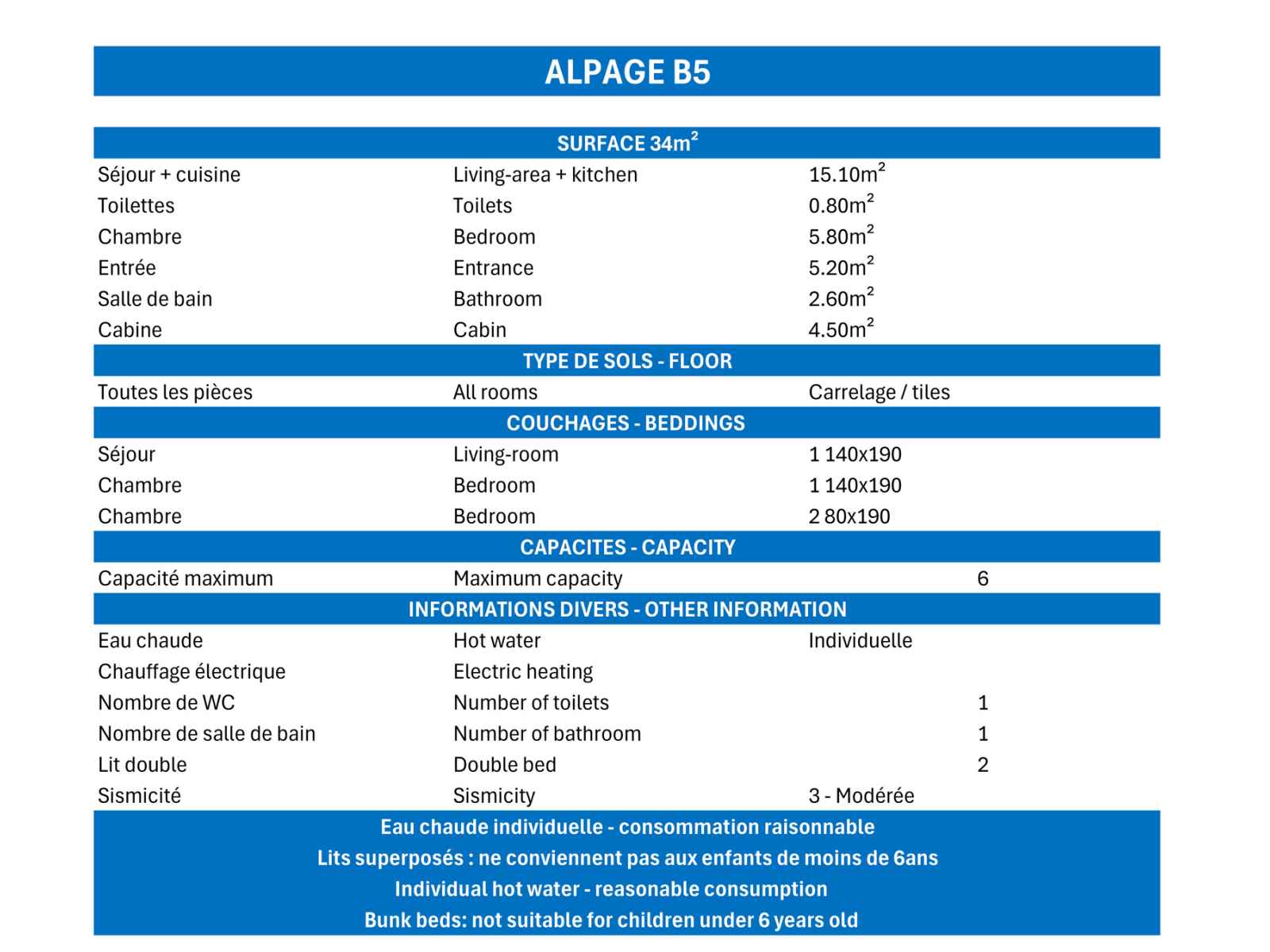 lave-linge avec sèche-linge Chambre : 1 lit double (140 x 190) Cabine (avec fenêtre) : 1 lit superposé (80 x 190) Salle de bains - Toilettes séparées Télévision connectée incluse Accès INTERNET GRATUIT, connexion Internet non garantie, dépend du fournisseur d'accès A NOTER : chauffe-eau individuel offrant un bon confort, à condition d'être utilisé de manière raisonnable INTERDICTION DE FUMER - ANIMAUX ACCEPTÉS