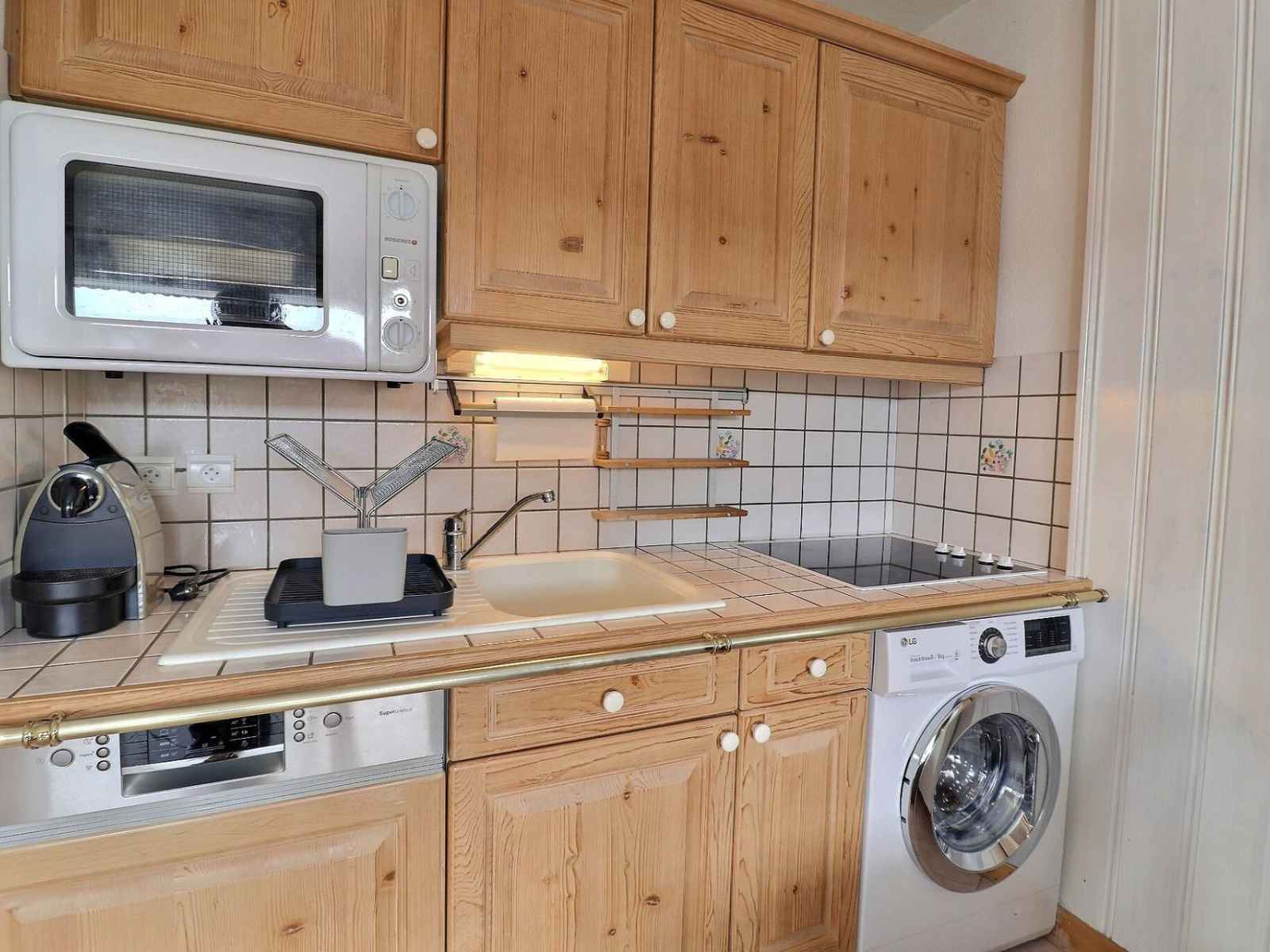 kitchenette ouverte : four, réfrigérateur, lave-vaisselle, 4 plaques vitrocéramiques, 1 machine à café nespresso, grille-pain, bouilloire,
