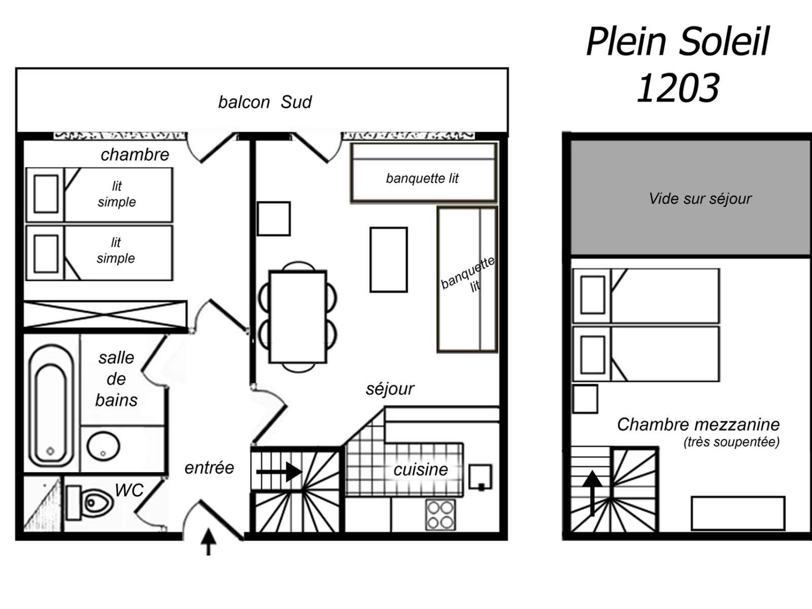 2 pièces avec mezzanine (soupentée), 6 personnes, 45m², balcon sud