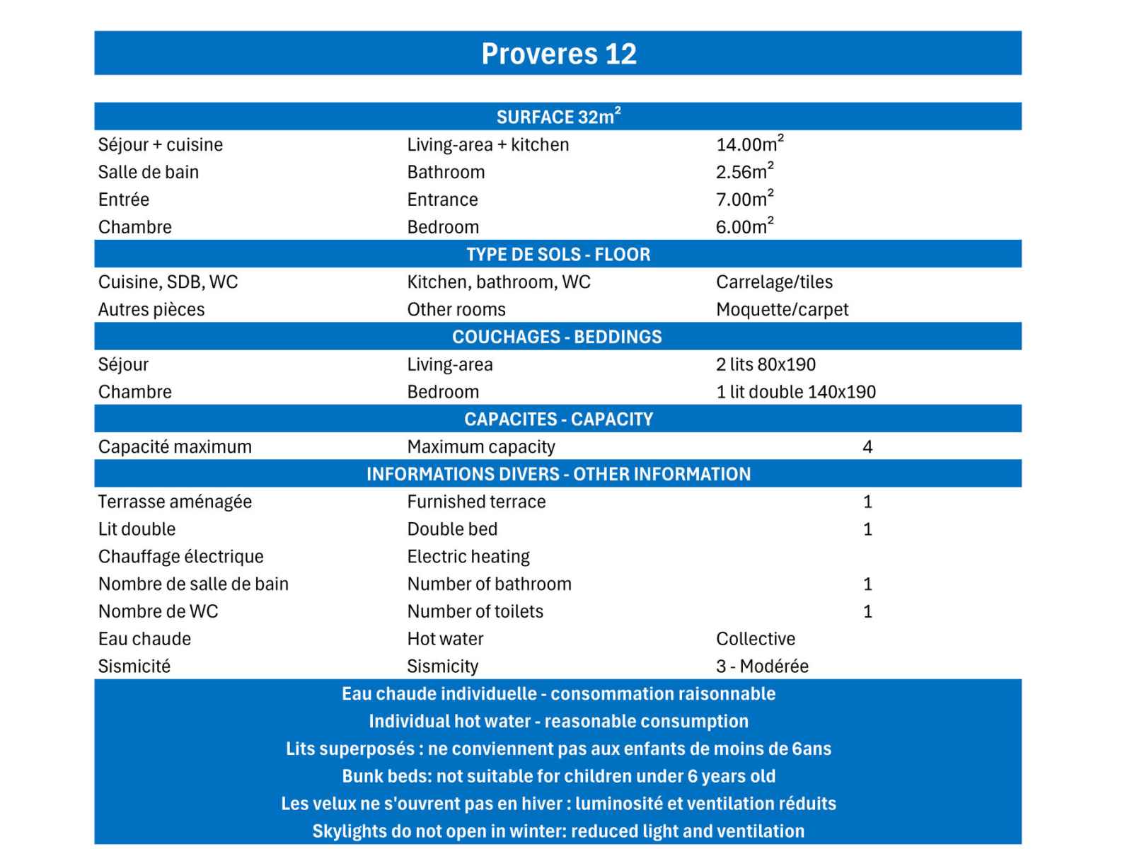 - Caution 350 € (CB ou chèque détruit au plus tard 14 jours après votre départ)