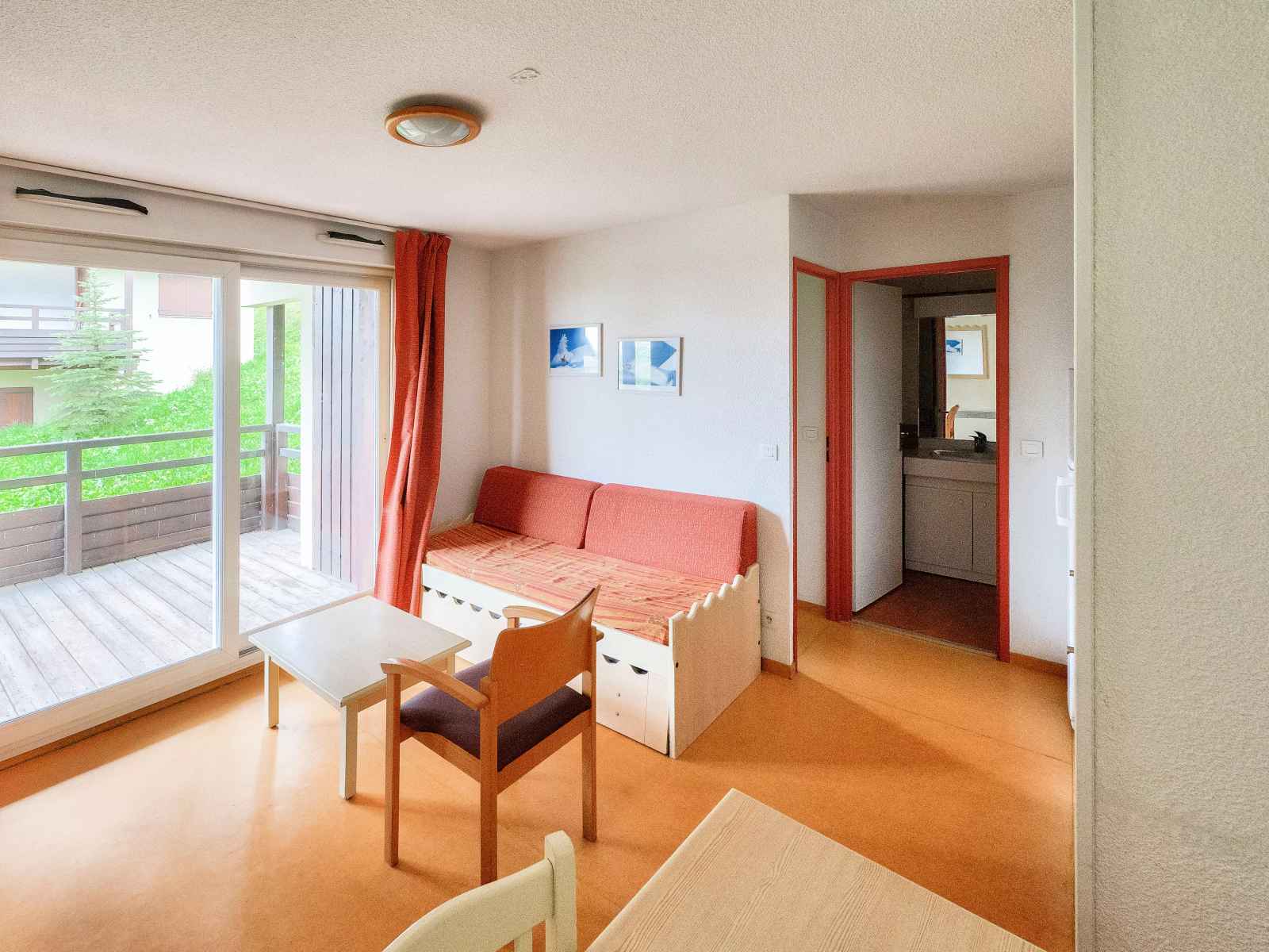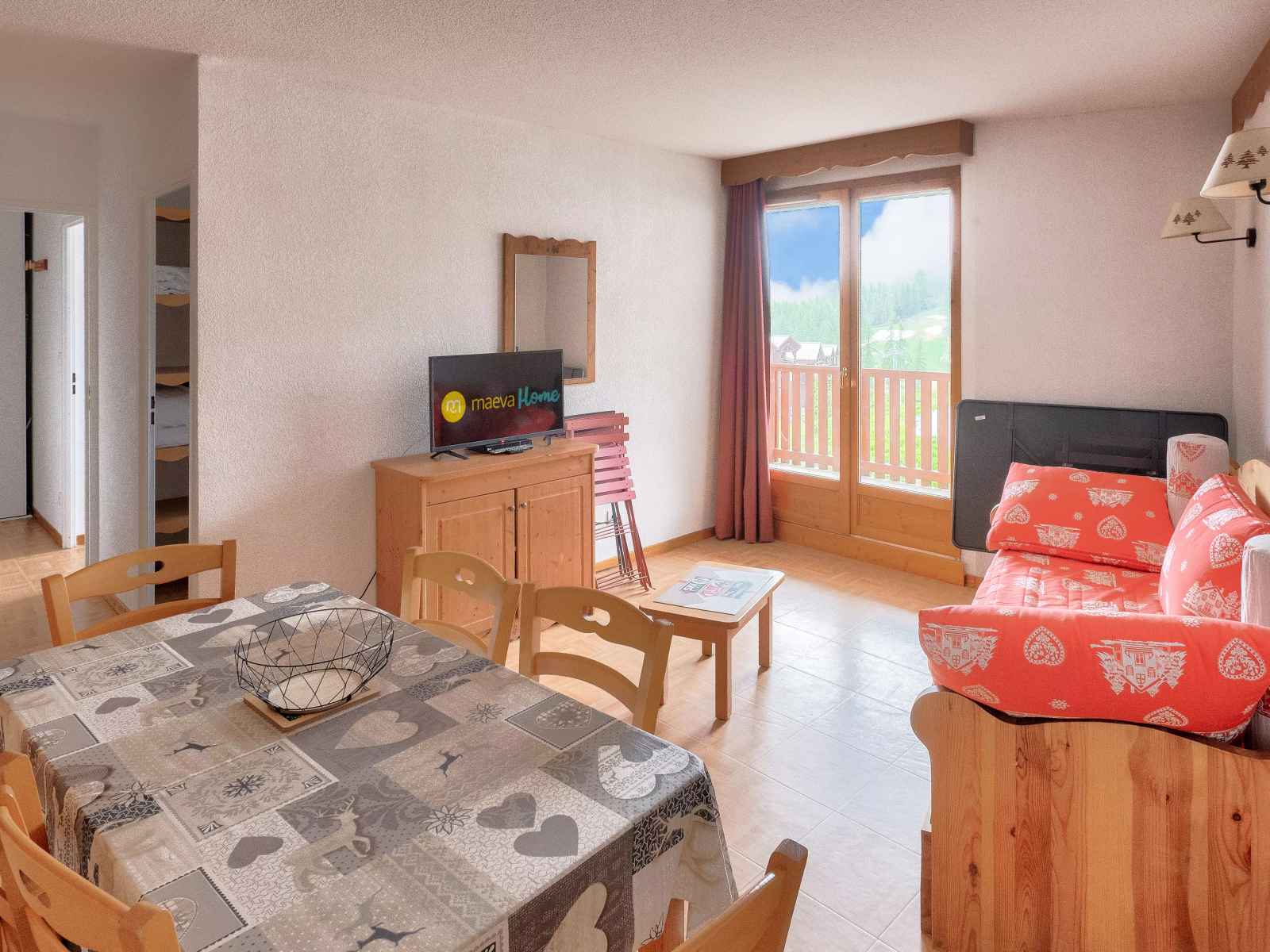 - pièce à vivre avec coin repas, salon avec un canapé-lit clic-clac, tv écran plat et accès au balcon
