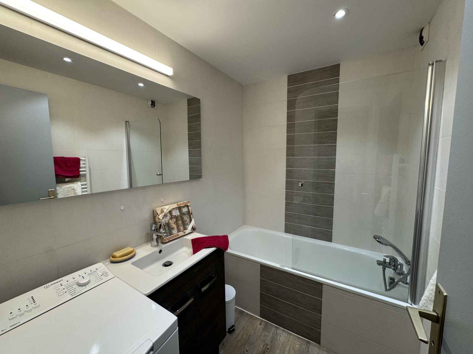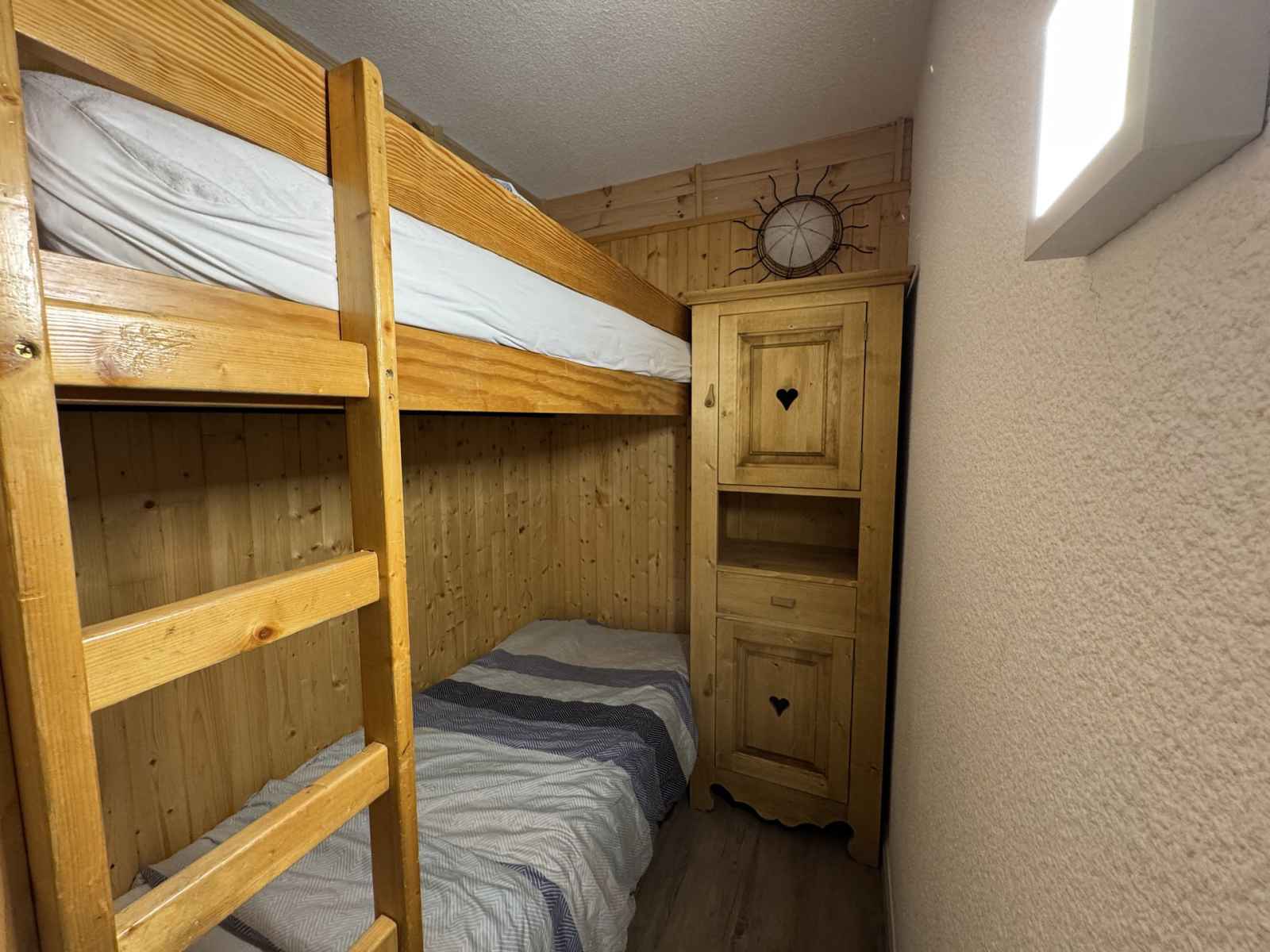 vous avez la possibilité de louer une place couverte dans la résidence. Vous trouverez dans l’appartement : un coin cuisine aménagé avec réfrigérateur, plaque vitro, four multifonctions et lave-vaisselle. Un séjour avec un canapé lit gigogne, télévision Cabine avec deux lits simples superposés Une chambre avec un lit double 140 cm x 190 cm Salle de bain et une salle d’eau avec lave-linge toilette séparé Accès à un casier à skis privé numéroté comme l’appartement Prestations non incluses dans le tarif : Linge de toilette, Linge de lit, matériel Bébé, Ménage de fin de séjour Appartement non-fumeur Les animaux domestiques ne sont pas acceptés dans la location.