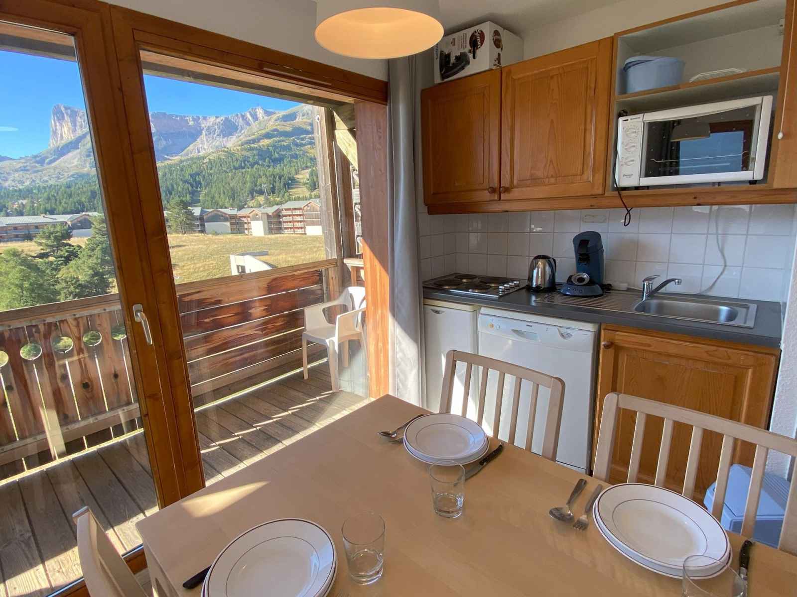 kitchenette entièrement équipée. lave vaisselle, mini four, cafetière filtre, et cafetière senseo, grille-pain, bouilloire électrique.