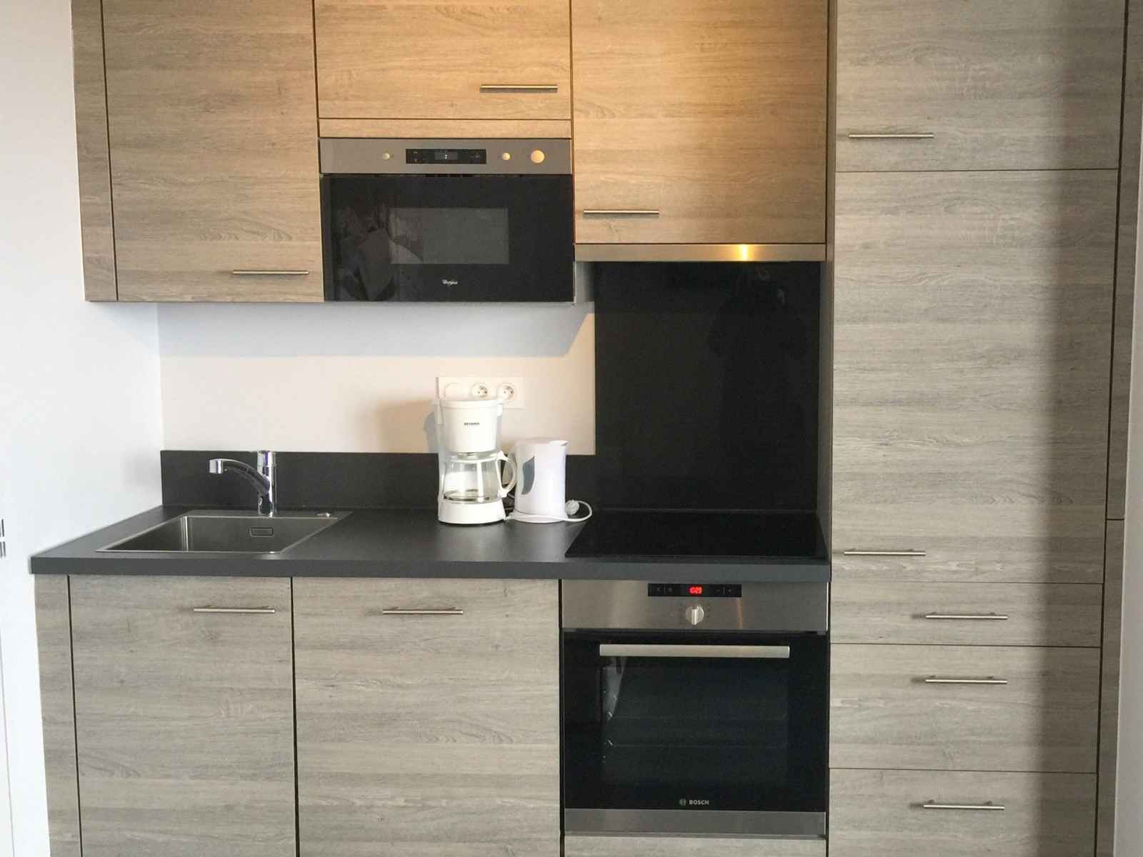 coin cuisine: four, micro-ondes, plaques induction, réfrigérateur, lave-vaisselle et hotte.