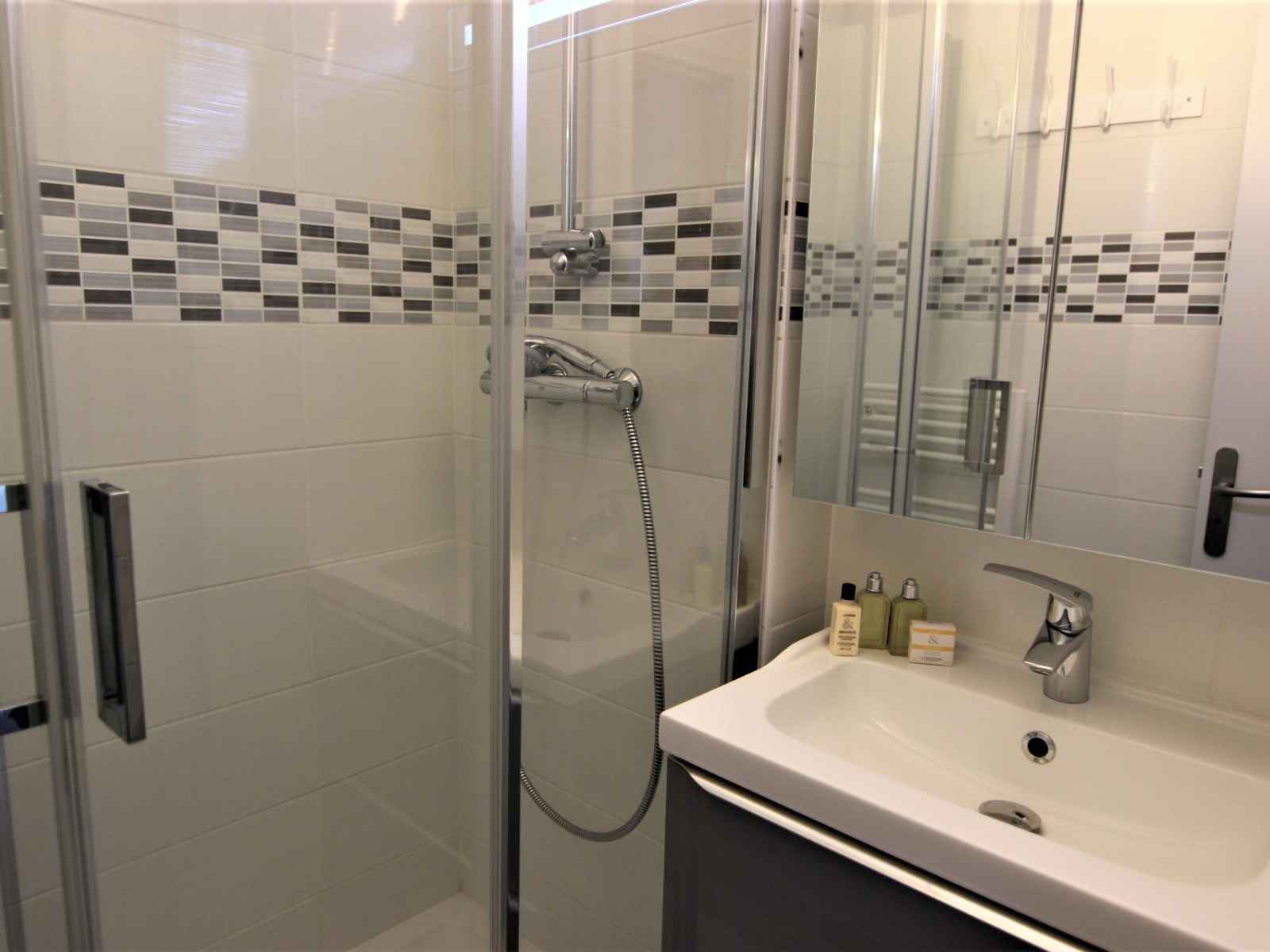 salle de bain: douche, lavabo.