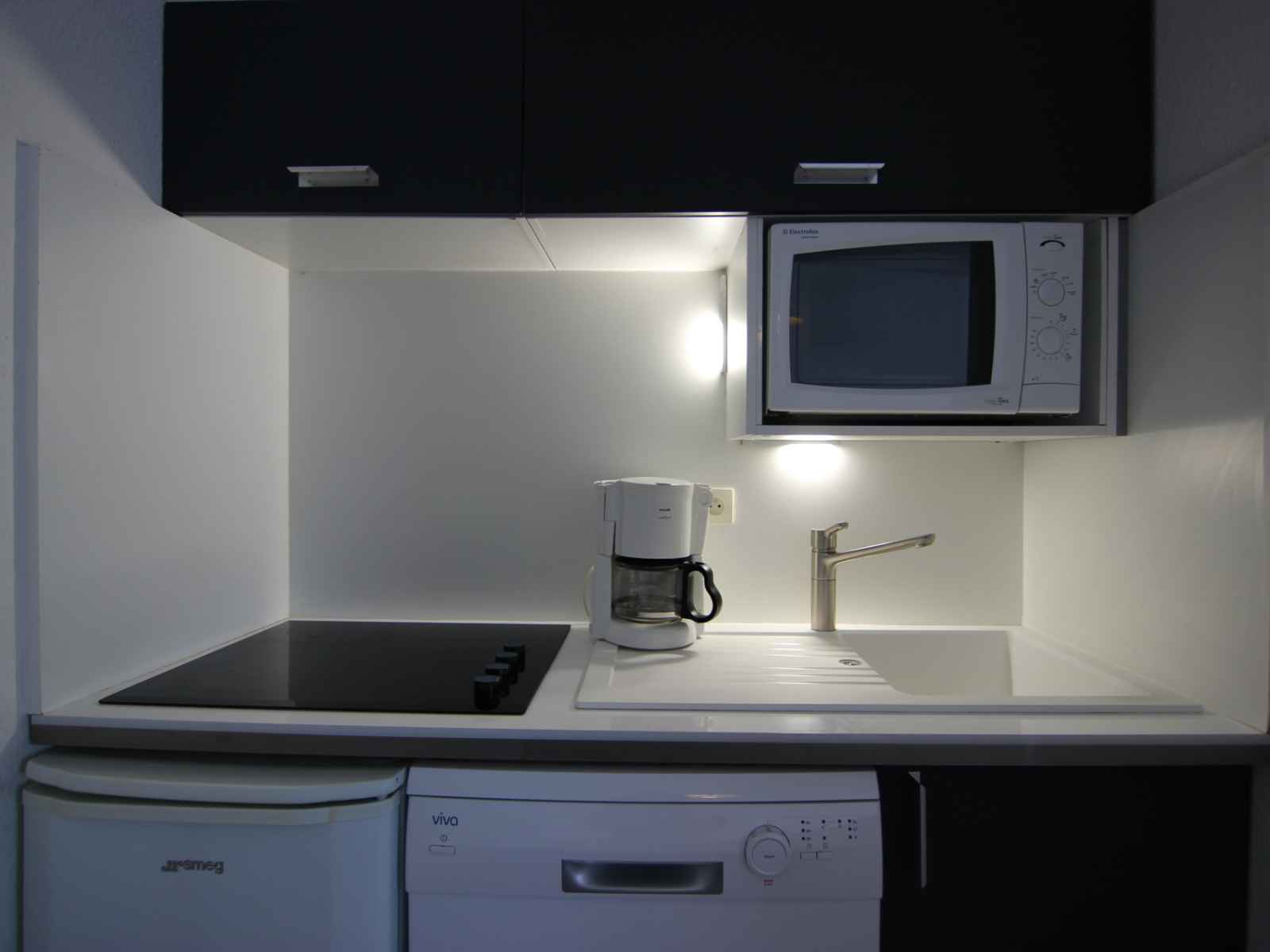 coin cuisine: micro-ondes, plaques vitrocéramiques, réfrigérateur et lave vaisselle.