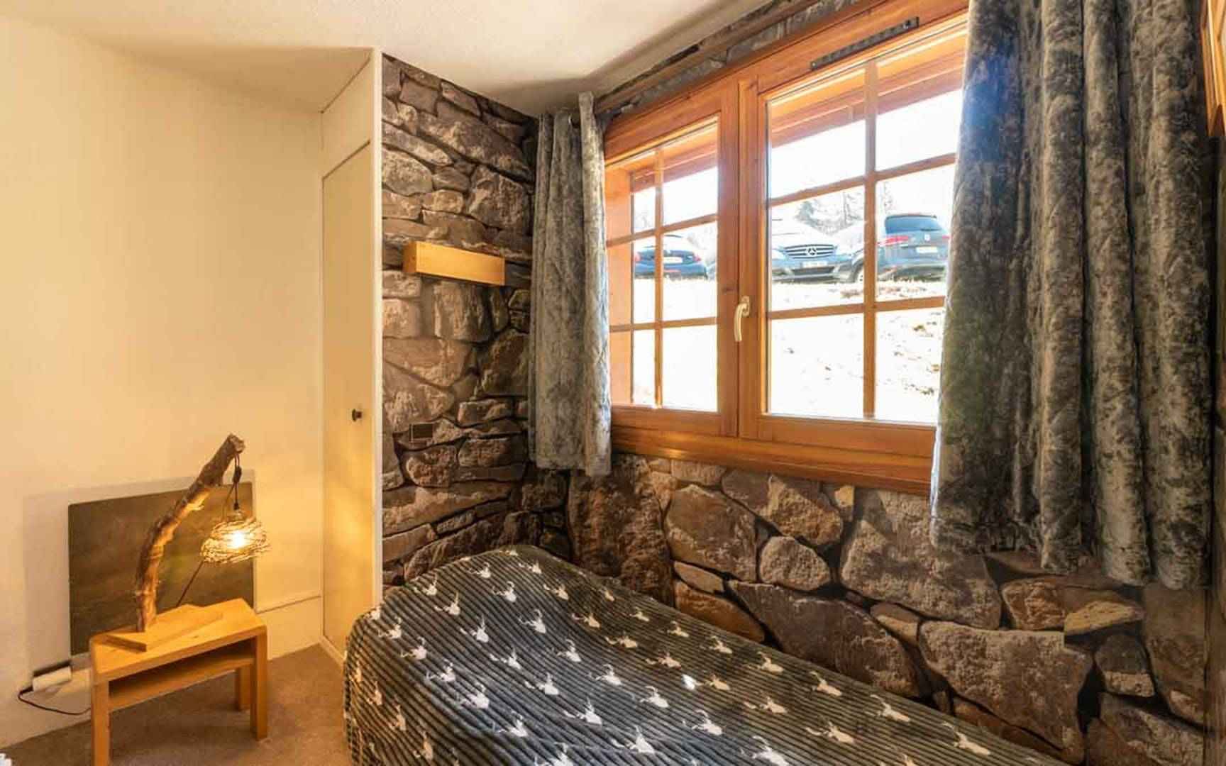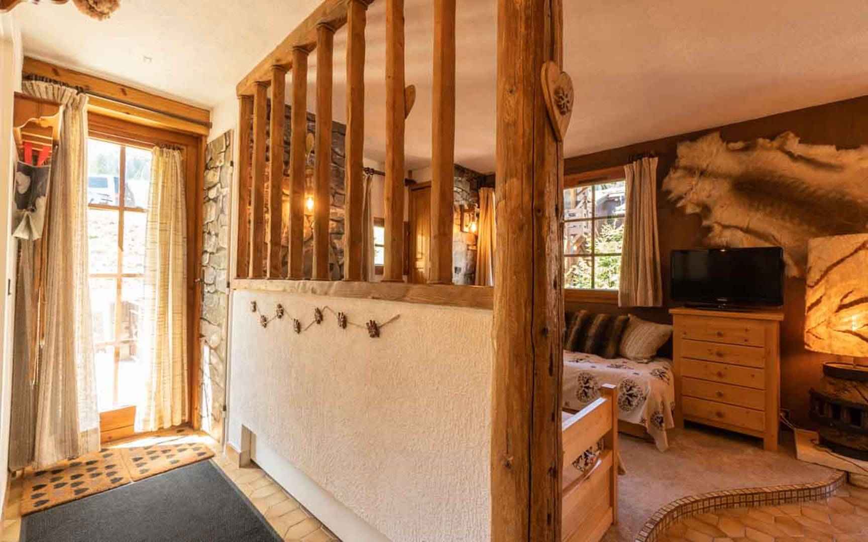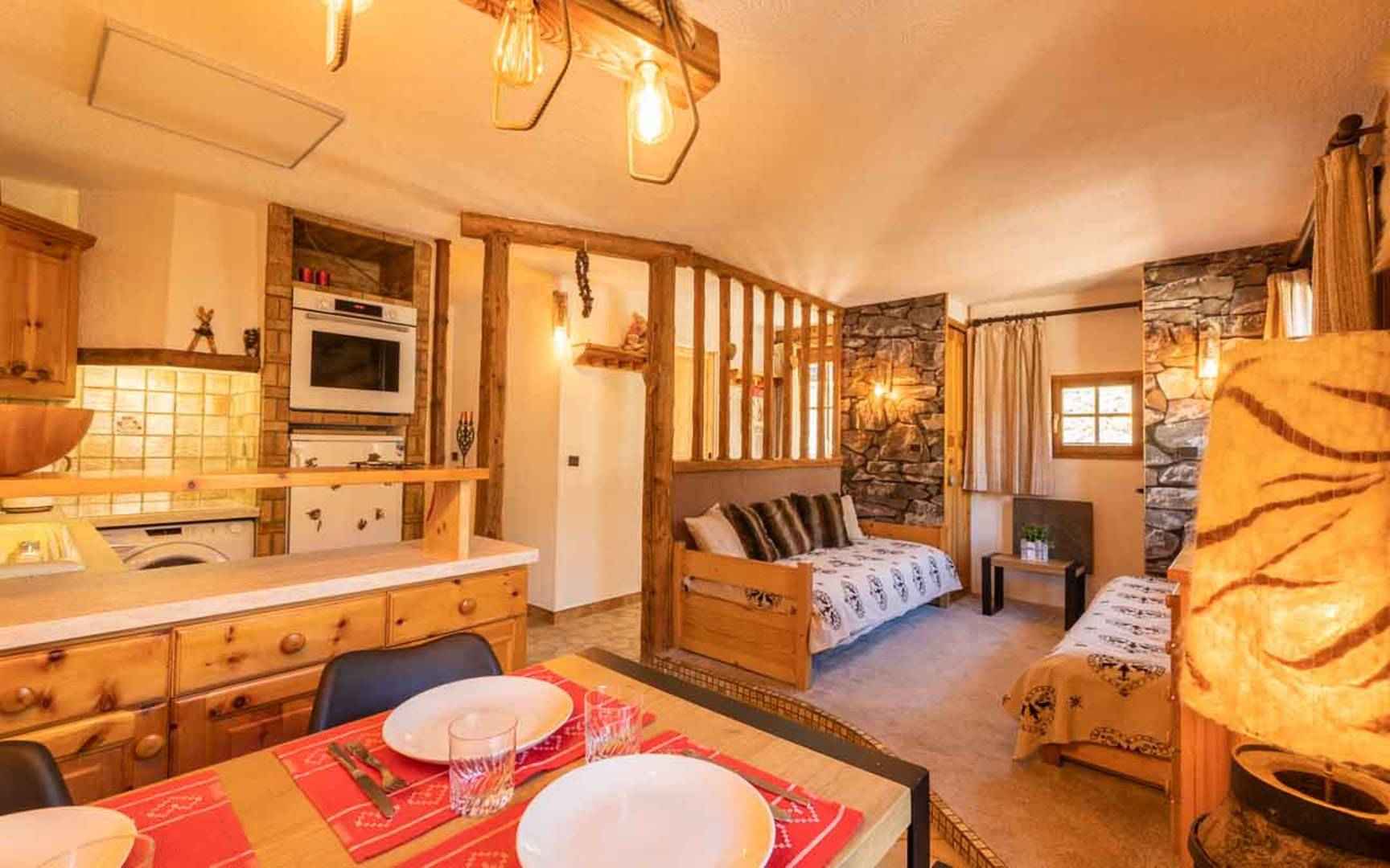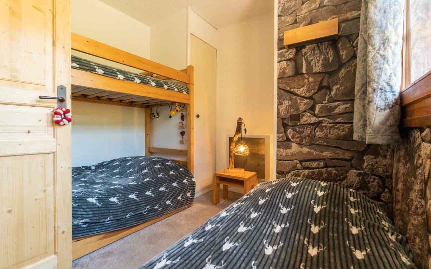 entrée avec placard, cuisine ouverte sur le séjour séjour avec 2 banquettes simples 90x190. chambre avec 2 lits superposé 90x190
