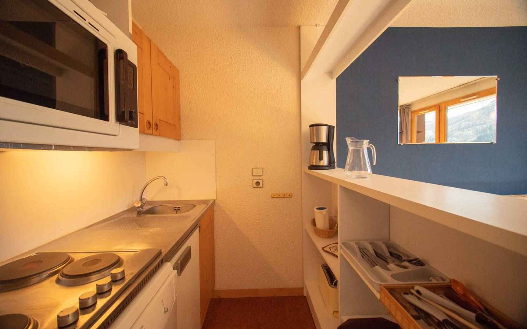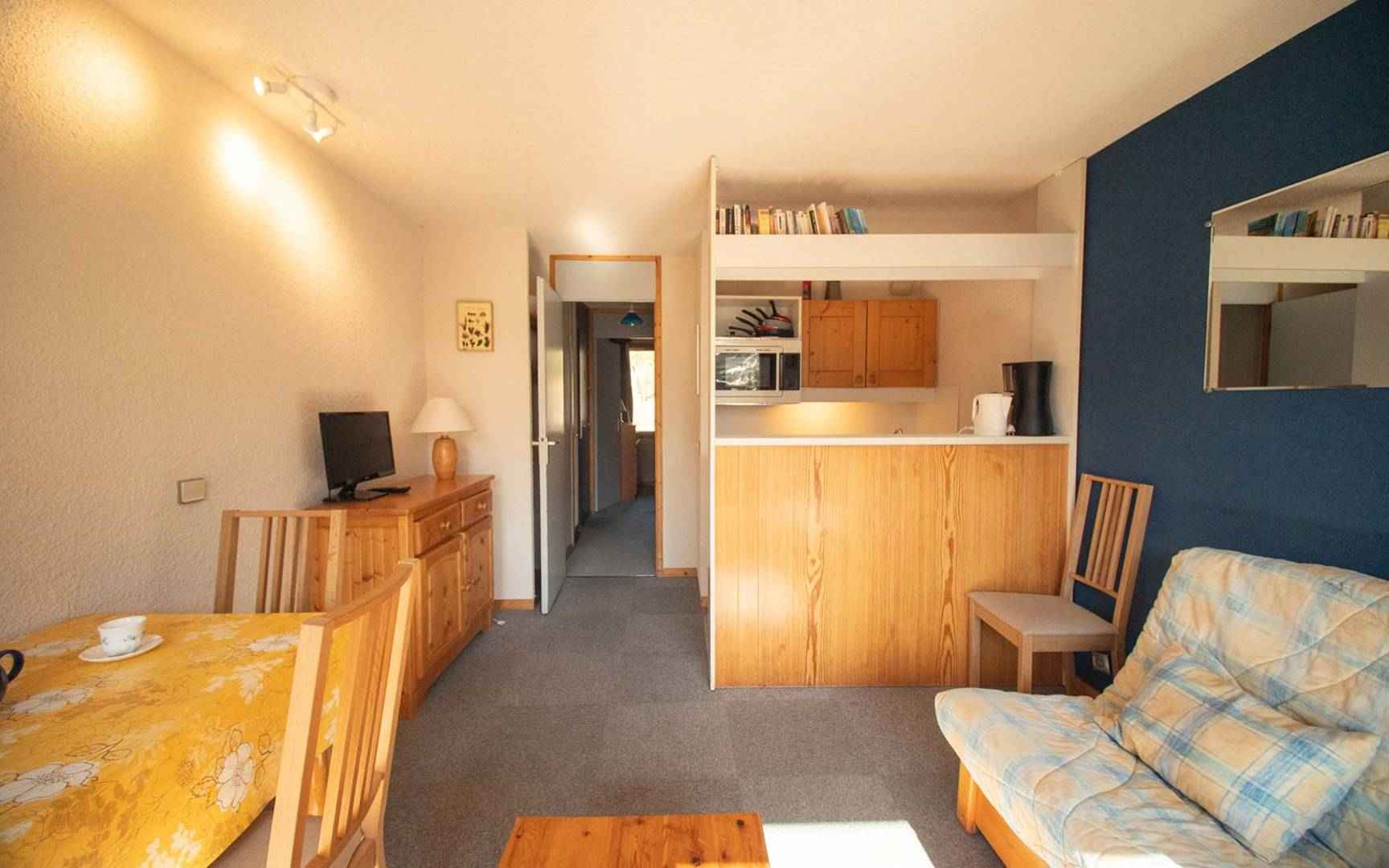 entrée, cuisine ouverte sur le salon avec canapé convertible (2 couchages),