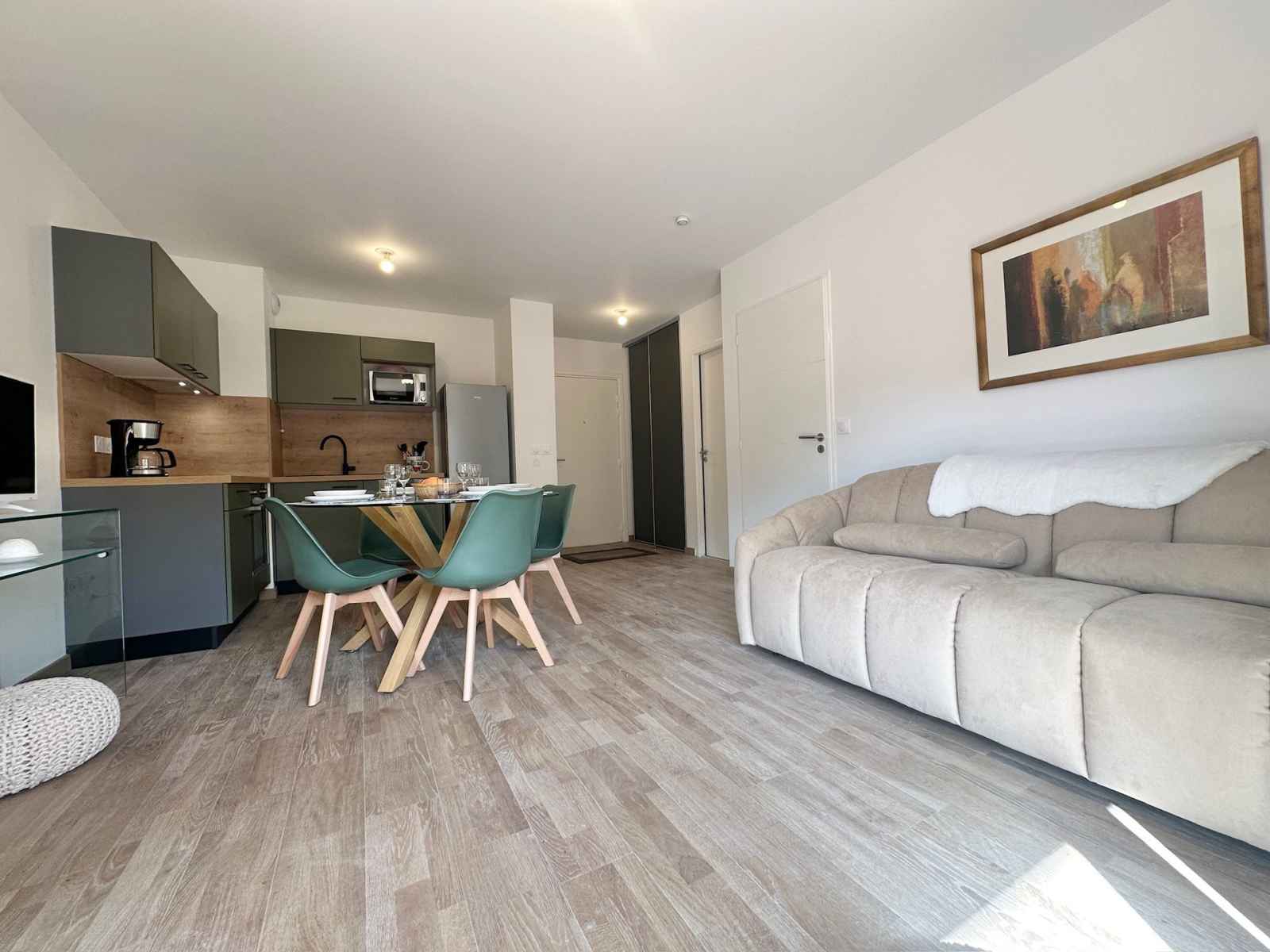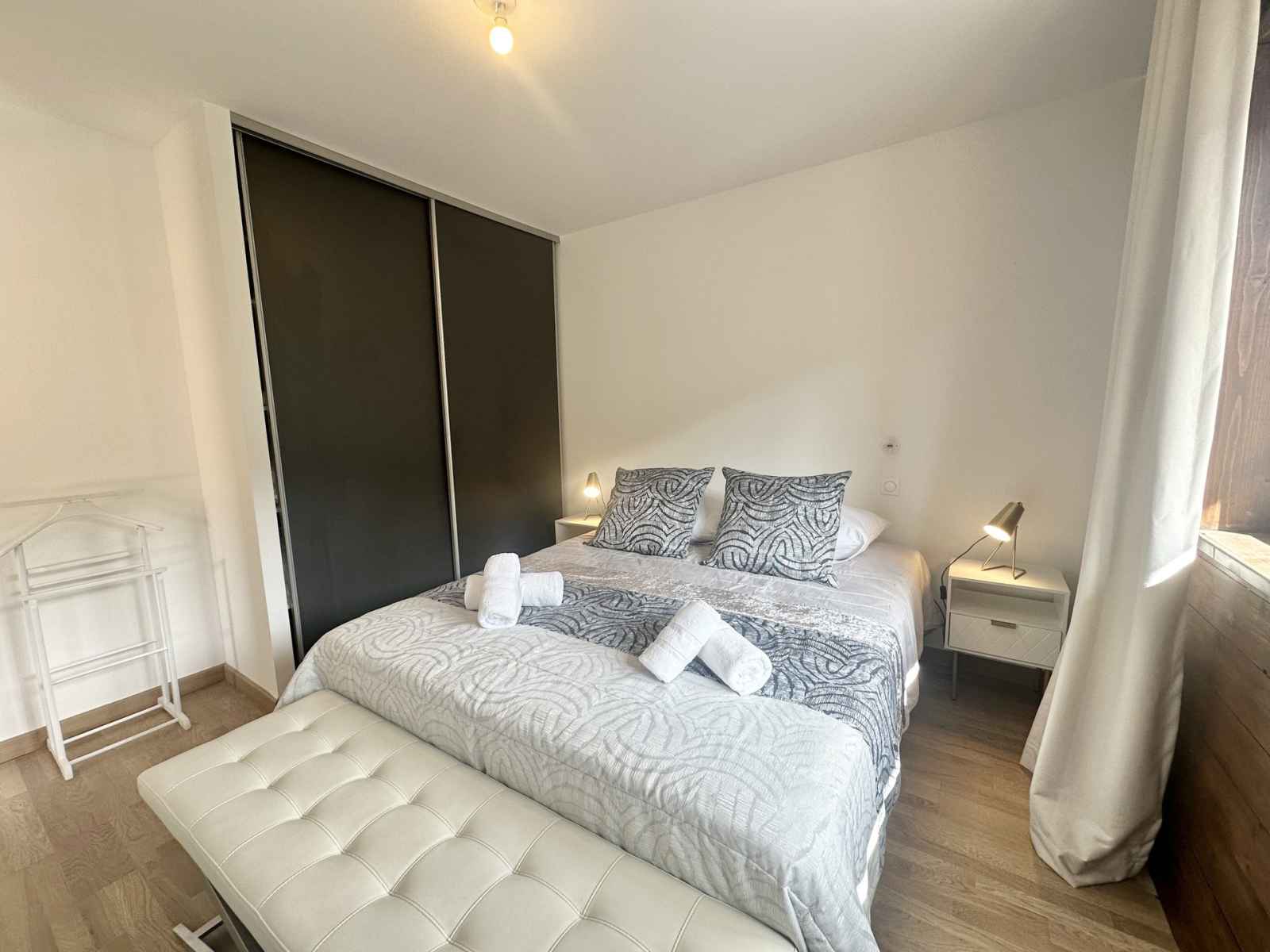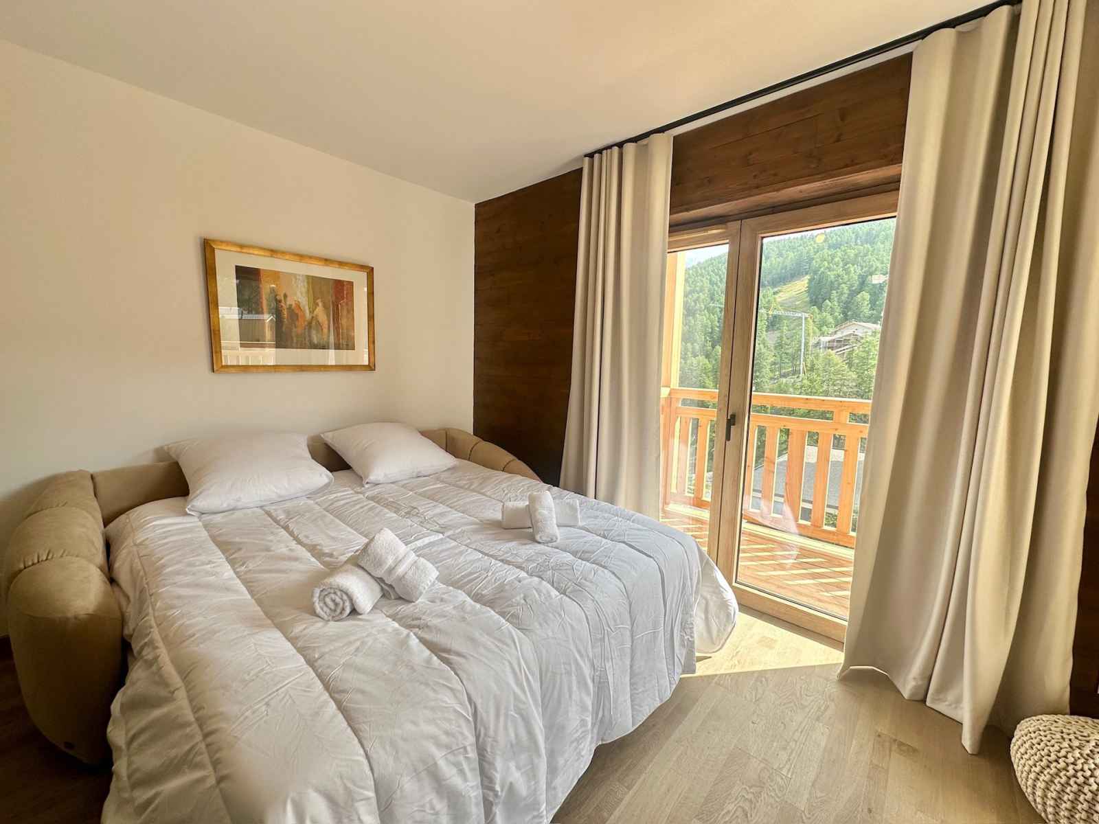 et sa luminosité exceptionnelle. L'appartement comprend une grande chambre double équipée d'un spacieux placard de rangement et d'un lit confortable en 160x200 avec un matelas de 23 cm d'épaisseur. Le salon dispose également d'un canapé-lit de qualité, avec un véritable matelas en 160x190 et 15 cm d'épaisseur, parfait pour accueillir vos invités en tout confort. La pièce à vivre, vaste et baignée de lumière, offre une vue sublime sur les montagnes environnantes. Une grande terrasse vous permettra de savourer votre petit déjeuner en profitant du soleil levant. La cuisine, entièrement équipée, est prête à satisfaire toutes vos envies culinaires : machine à café à filtres, plaques à induction, four traditionnel et micro-ondes, réfrigérateur avec compartiment congélateur, et lave-vaisselle. Enfin, vous trouverez une élégante salle d'eau avec WC, parfaitement aménagée pour votre confort. Atout de l'appartement: Parking privatif couvert, casier à skis Travaux en cours à proximité