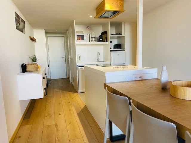 Cuisine comprenant : four combiné (grill + micro-ondes), lave-vaisselle, toaster, bouilloire, cafetière électrique à filtre + Nespresso, 3 plaques à induction et réfrigérateur/freezer