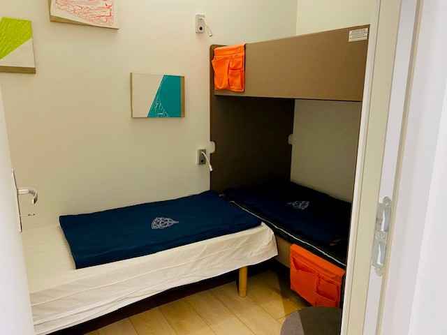 Chambre Cabine 2 : 1 lit simple et de 2 lits superposés en 80cm (le couchage en hauteur ne convient pas aux enfants de moins de 6 ans)