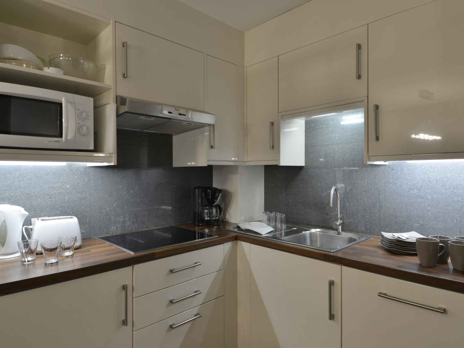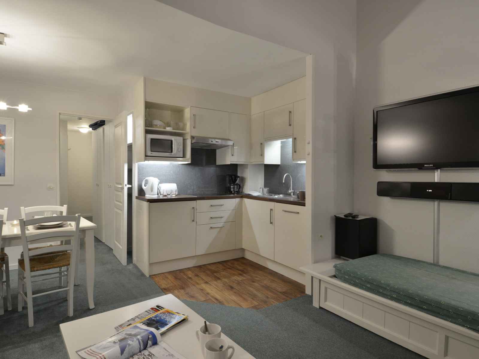 cuisine : ouverte avec un micro-ondes grill, un lave-vaisselle, un réfrigérateur et 1 plaque vitro céramique 4 feux