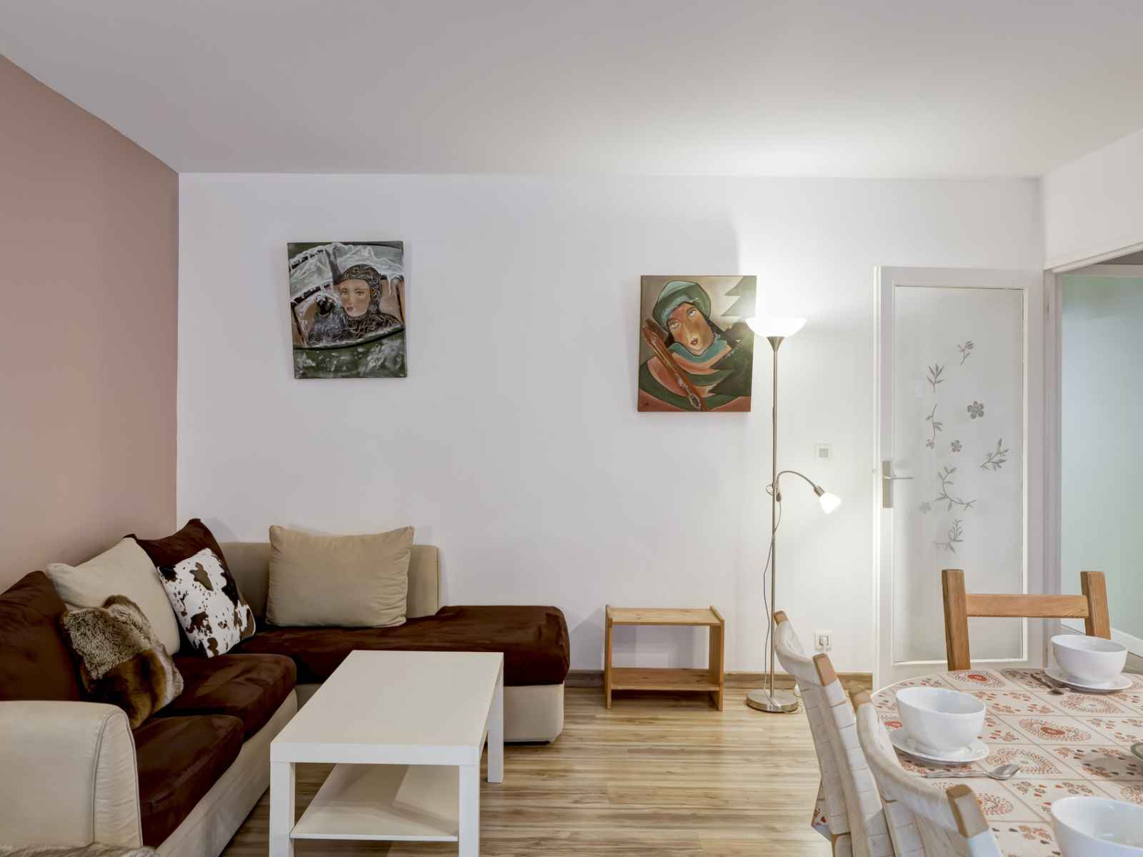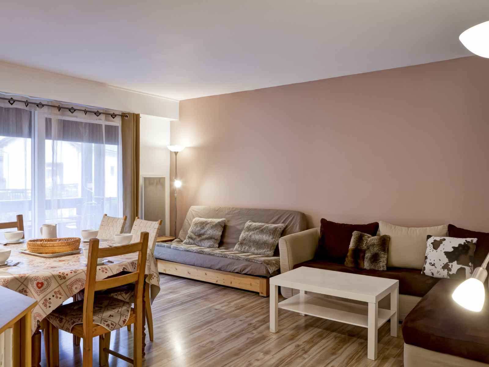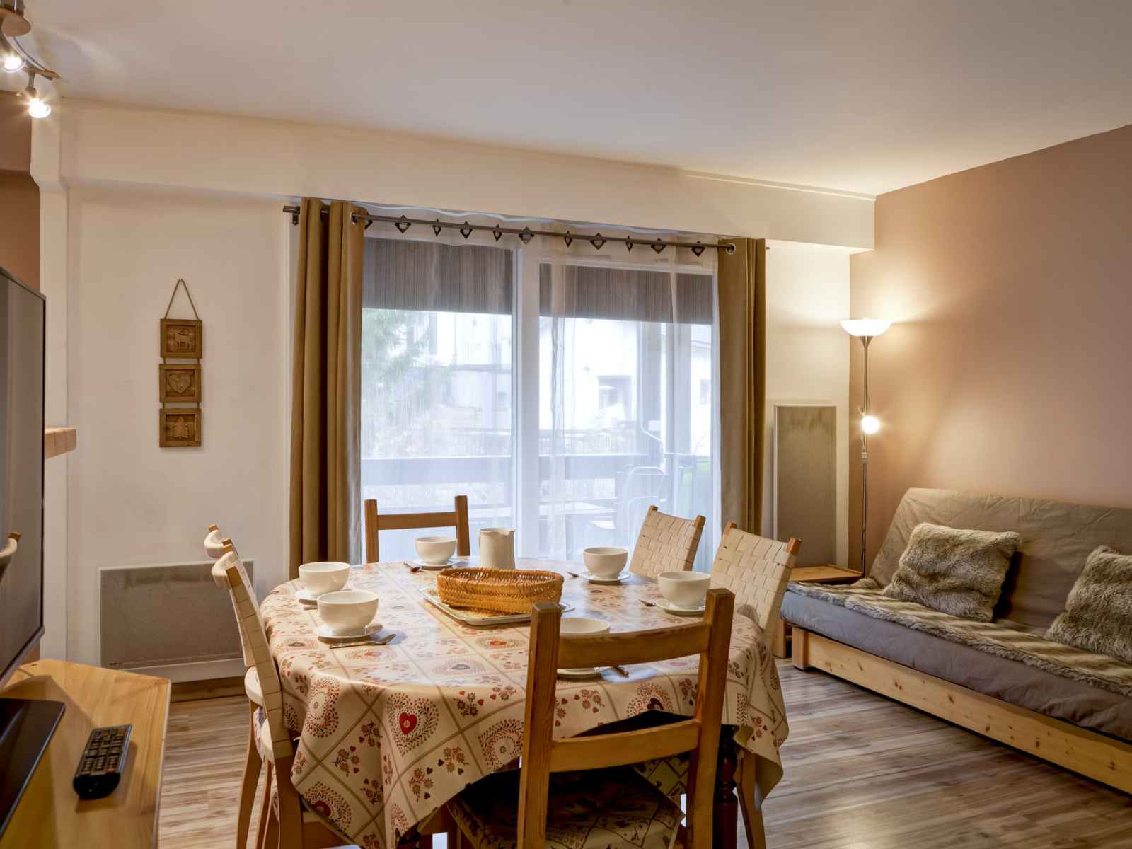 pièce à vivre lumineuse avec espace repas : 1 canapé lit clic clac (2 personnes), coin salon avec télévision.