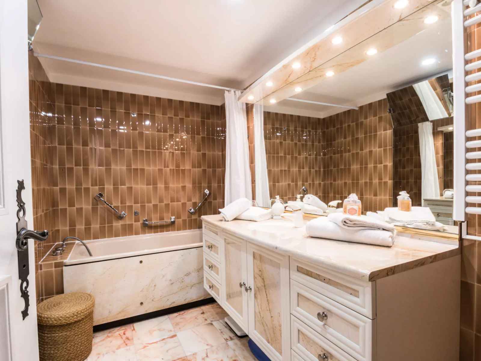 - Une salle de bains avec toilettes et sèche-serviettes