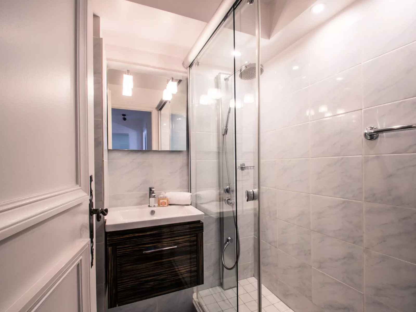 - Une salle de douche avec toilettes et sèche-serviettes