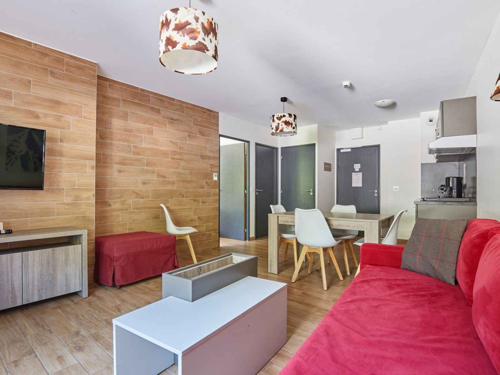 kitchenette équipée (plaque vitrocéramique, hotte, micro-ondes/gril, réfrigérateur, lave-vaisselle, cafetière à