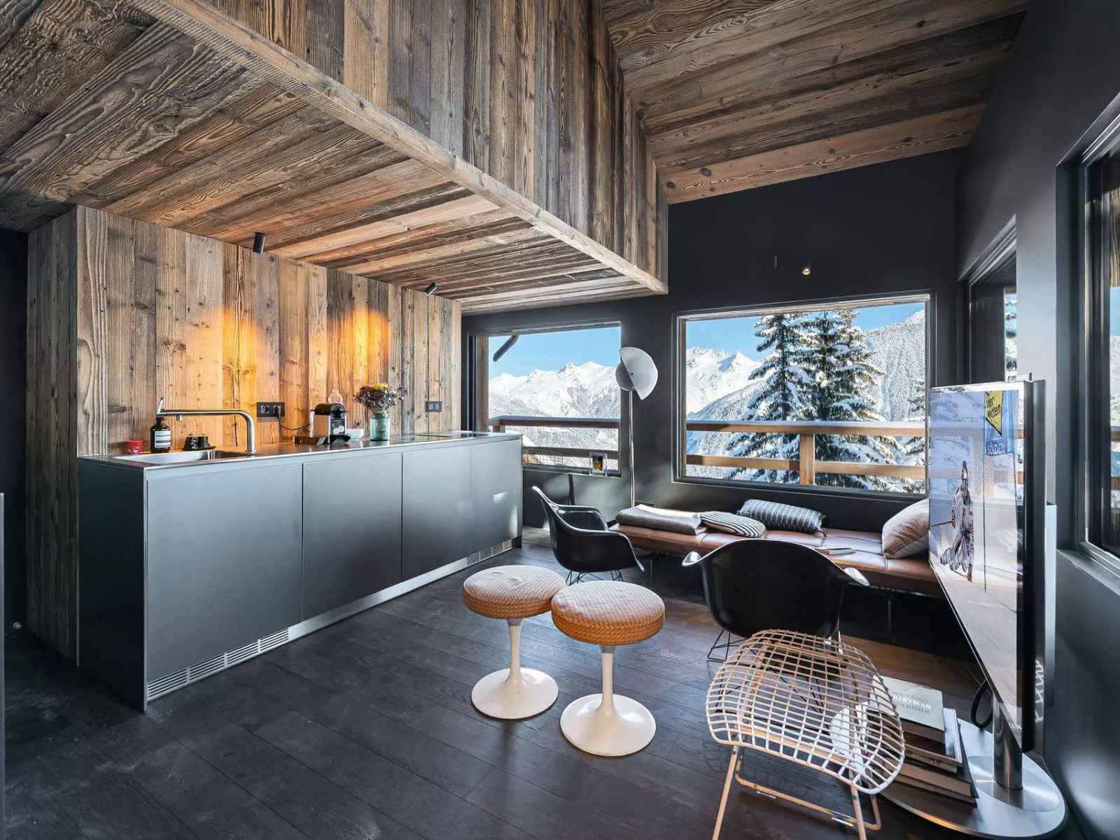 Chalet de 51m2, avec 4 chambres et pouvant acceuillir jusqu'à 6 personnes. espaces de vie aux airs d'antan et mobilier confortable. au centre de courchevel, dans le quartier de bellecôte, entre comodités, pistes de ski et remontées mécaniques.