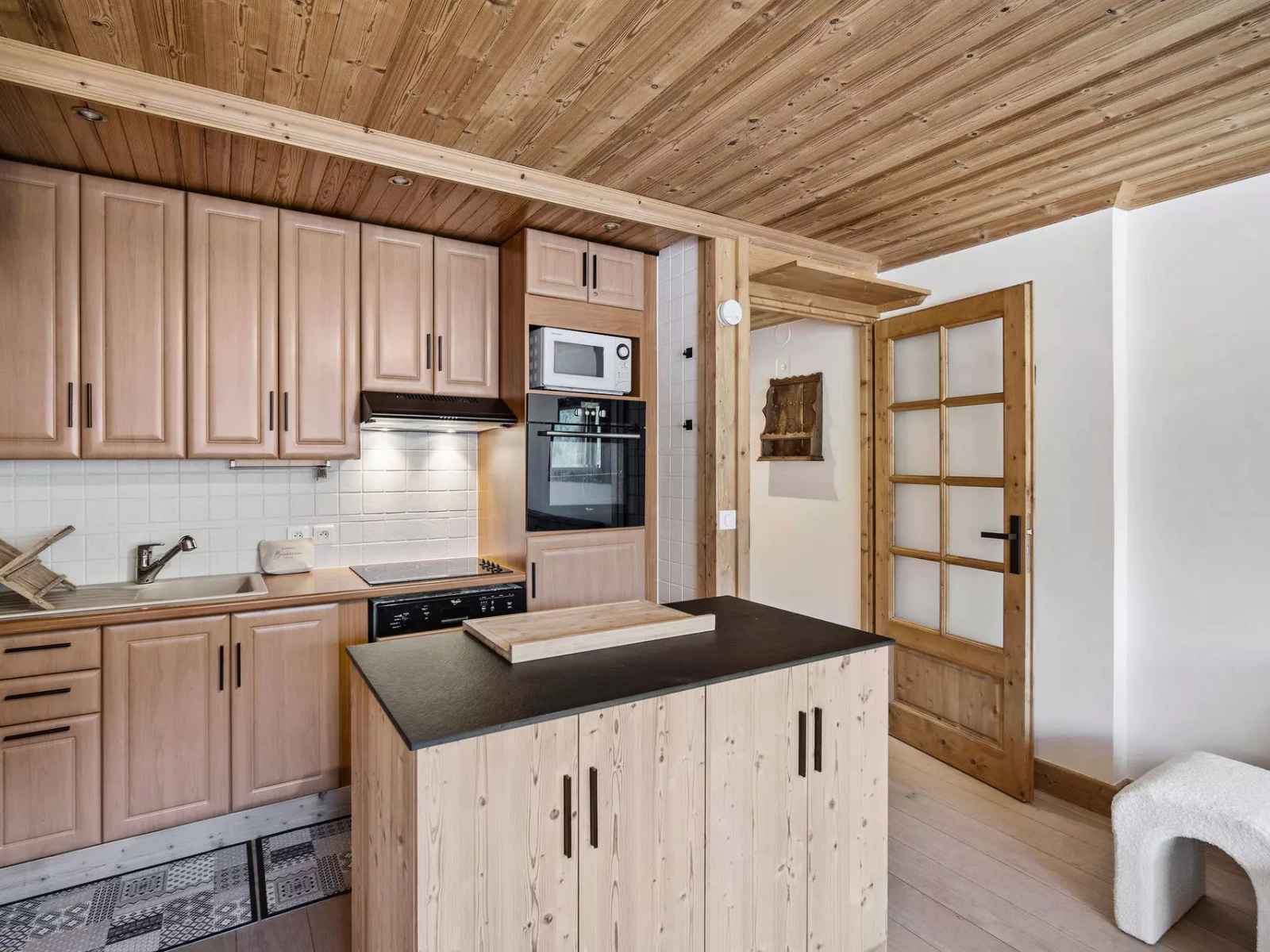 - Cuisine ouverte sur salon : plaques de cuisson, four, micro-ondes, lave-vaisselle, réfrigérateur, cafetière filtre