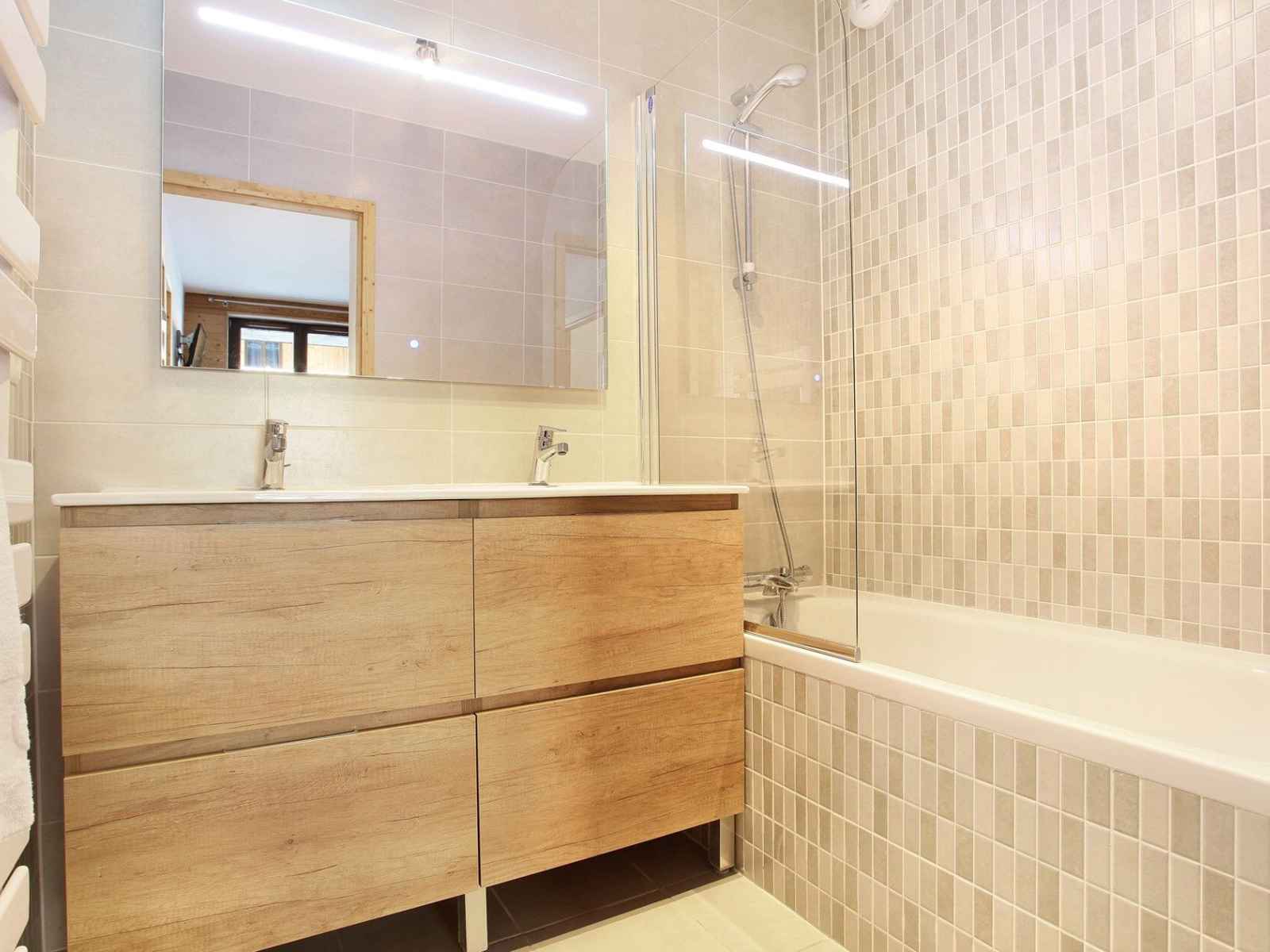 aménagée avec vasque, miroir et baignoire