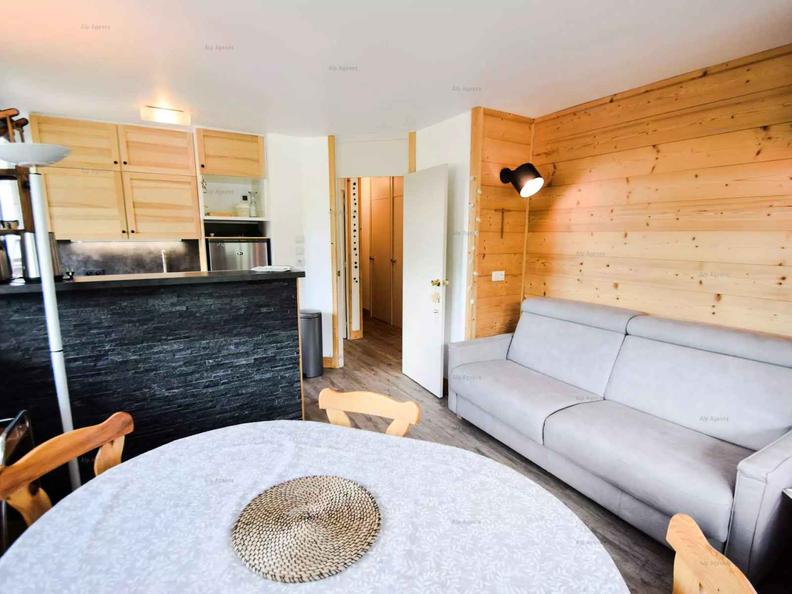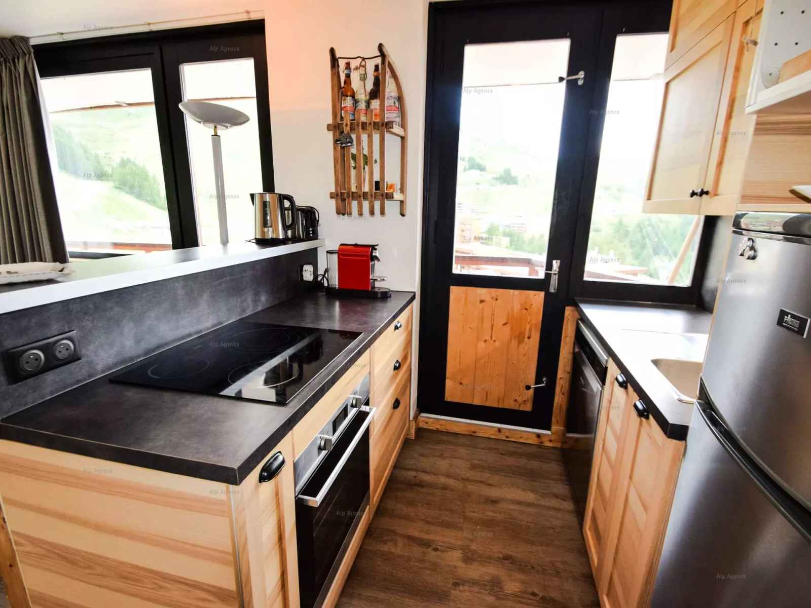 appartement 3 pièces 6 pers., 48m2, grand balcon en angle plein sud, vue sur les pistes - 8ème étage avec ascenseur - cuisine : 3 plaques vitrocéramiques. réfrigérateur avec partie congélateur, four traditionnel, lave-vaisselle, cafetière à