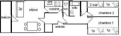 appt 3 pièces, 6/7pers : 57m2 env. exposé plein sud, belle vue sur les pistes, balcon donnant au 1er étage côté pistes, accès 2ème étage côté route sans ascenseur -. cuisine séparée : 4 plaques vitro-céramiques, réfrigérateur,