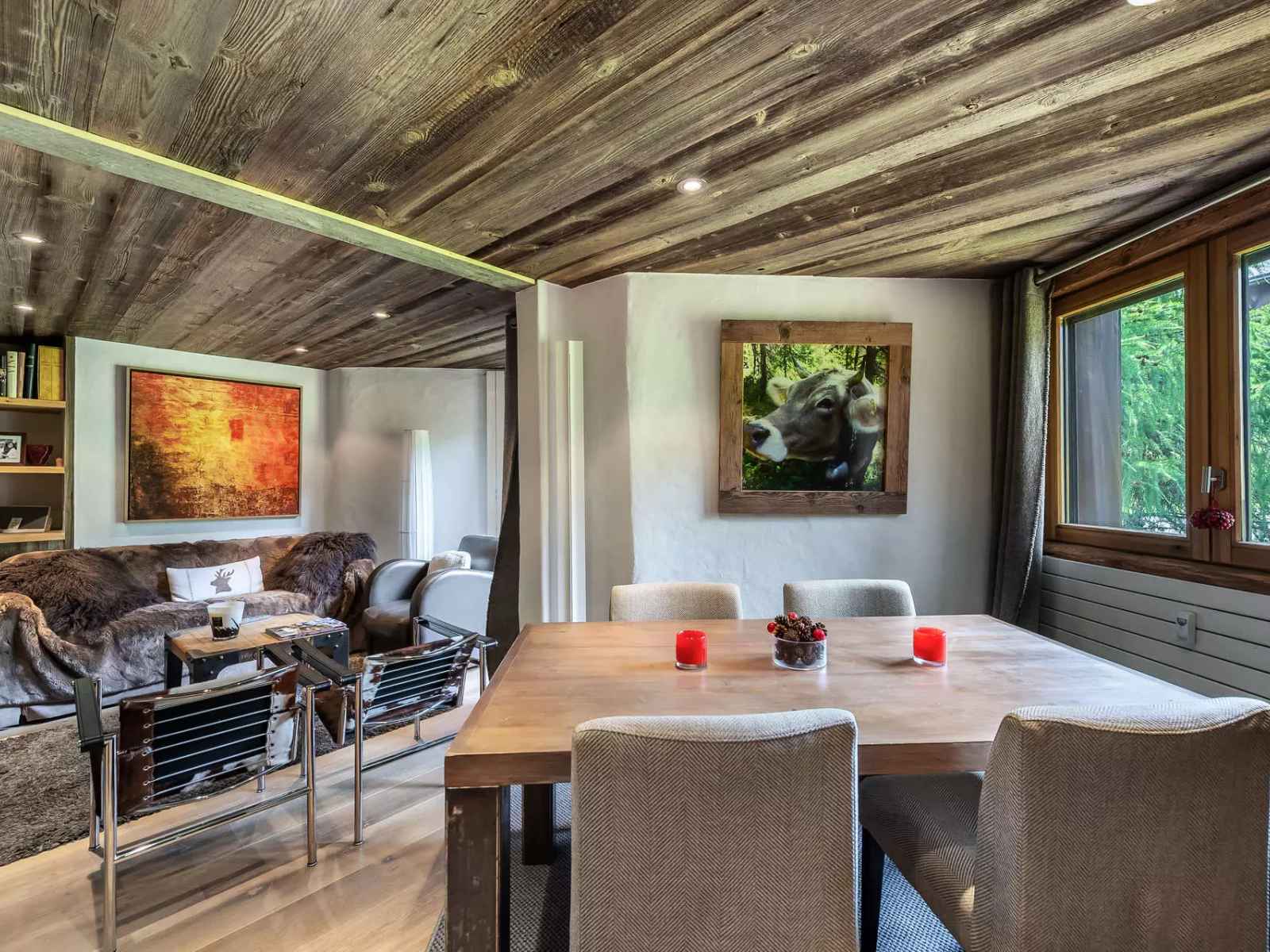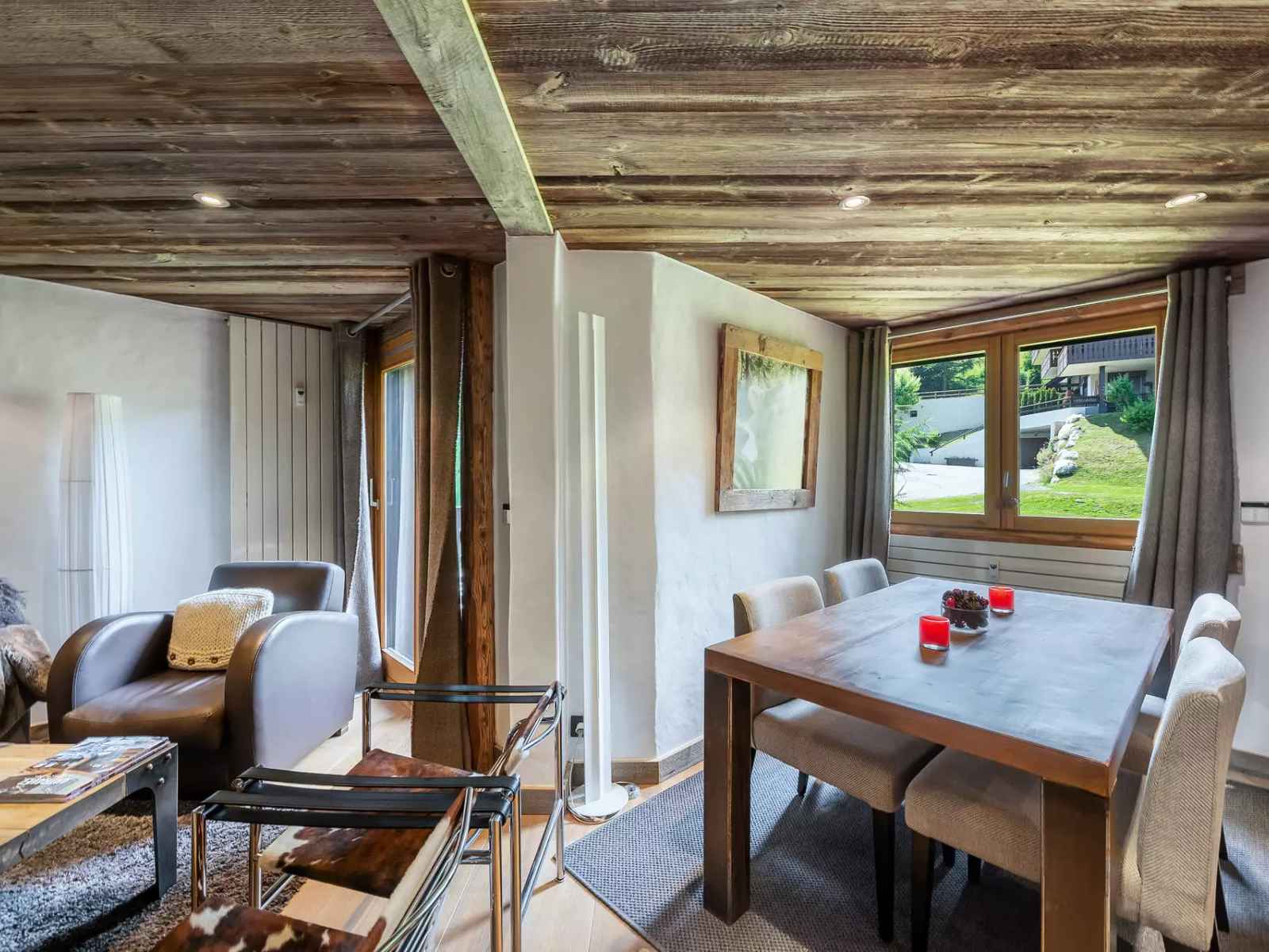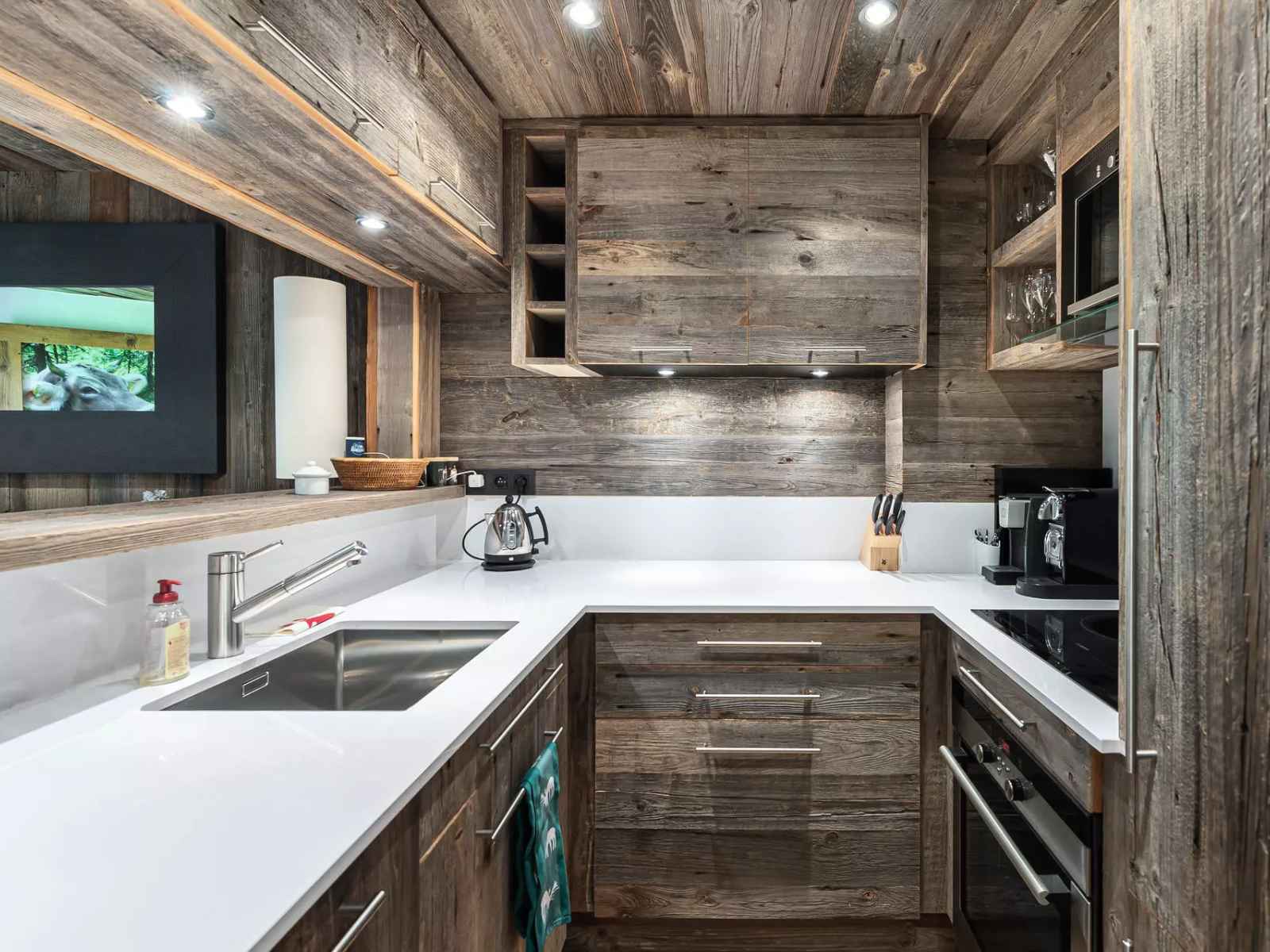 - Pièce de vie avec cuisine ouverte (grille-pain, appareil à fondue, micro-onde, plaque, four, lave-vaisselle, réfrigérateur), salon avec cheminée décorative et enceinte BOSE connectée, canapé, espace repas, accès balcon avec mobilier extérieur,