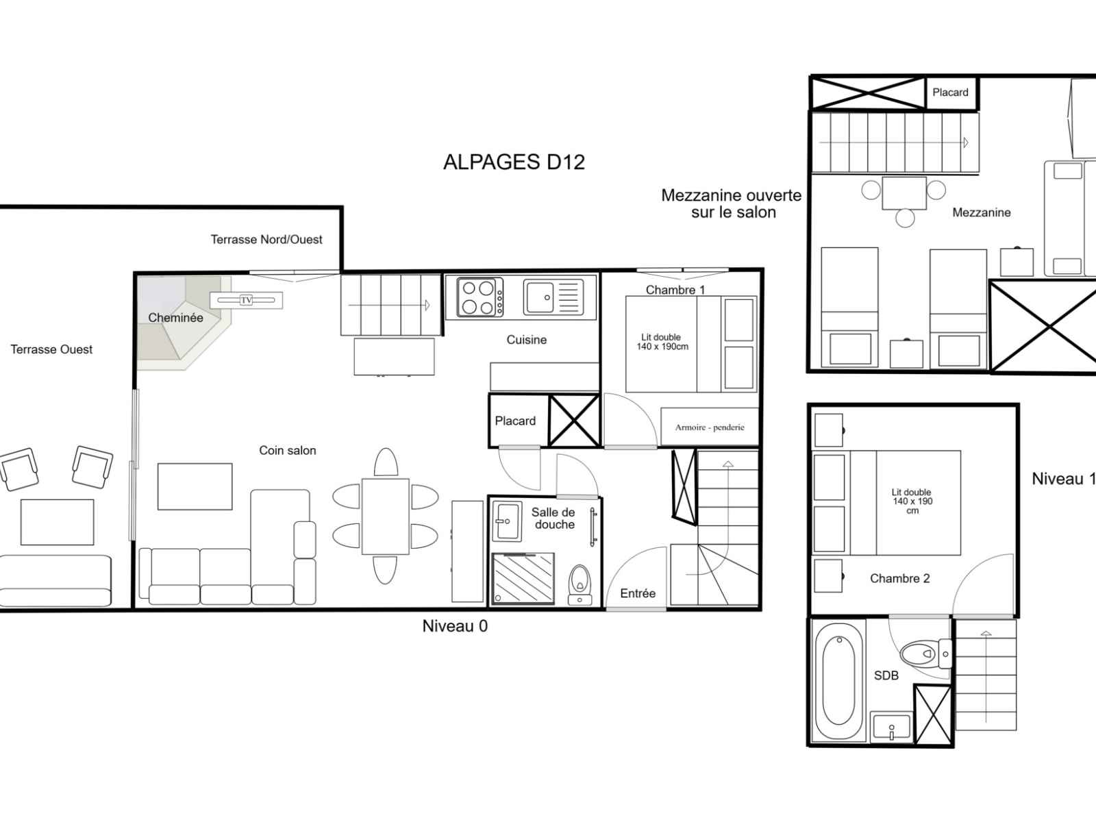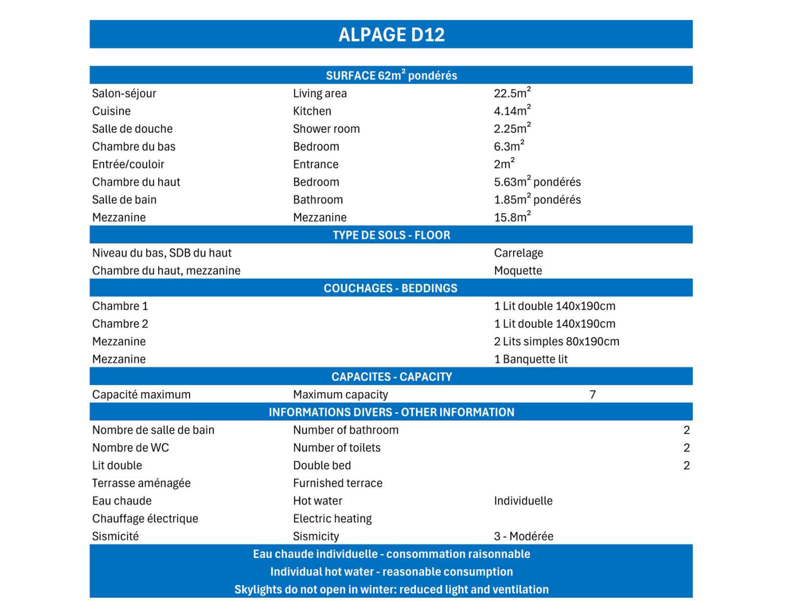 micro-ondes, lave-vaisselle, 4 plaques vitrocéramiques, cafetière à filtre, cafetière Nespresso, grille pain, bouilloire Chambre 1 : 1 lit double (140x190cm) Salle de douche avec toilettes Etage : Mezzanine (avec vélux fixe) ouverte sur le séjour avec 2 lits simples (80 x 190cm) et 1 lit banquette (90 x 190cm) Chambre 2 (soupentée - avec vélux fixe) : 1 lit double (120 x 190cm) avec une salle de bain et toilettes Petite télévision écran plat incluse Accès à la terrasse en angle avec salon de jardin NON-FUMEUR - ANIMAUX INTERDITS L’appartement vous laisse le choix de l’occupation de 7 des 9 couchages avec en particulier la possibilité de préserver l’espace salon en tant que pièce de vie– capacité et équipement maximum 7 personnes A NOTER : chauffe-eau individuel offrant un bon confort sous réserve d’une utilisation raisonnable