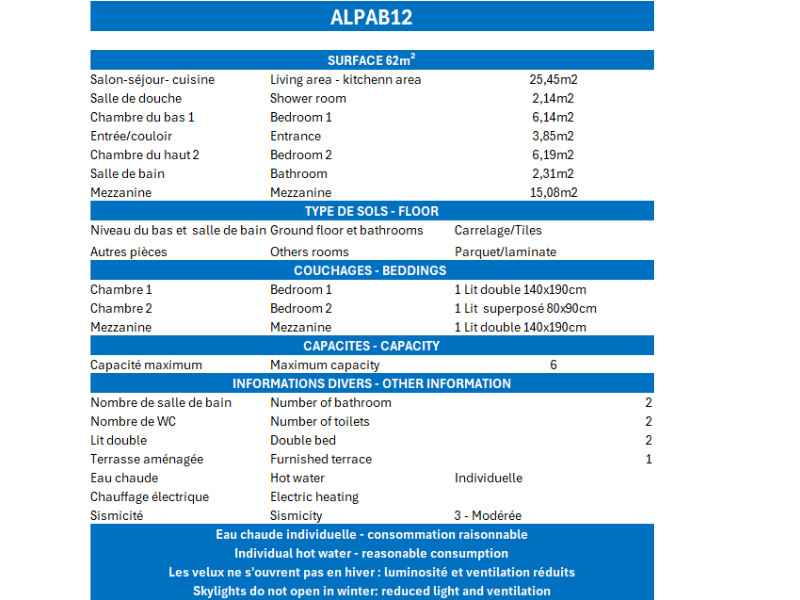 frigidaire, lave-vaisselle, 4 plaques vitrocéramiques, grille pain, cafetière Nespresso, bouilloire Chambre 1 : 1 lit double (140x190cm) Salle de douche avec toilettes Etage : Mezzanine (avec vélux fixe) ouverte sur le séjour avec 1 lit double (140 x 190cm) Chambre 2 (soupentée - avec vélux fixe) : 1ensemble de lits superposés (80 x 190cm) avec une salle de bain et toilettes Accès à la terrasse avec salon de jardin Accès INTERNET GRATUIT - connexion dépendante de l'opérateur, ne peut être garantie NON-FUMEUR - ANIMAUX INTERDITS A NOTER : chauffe-eau individuel (200 litres) offrant un bon confort sous réserve d’une utilisation raisonnable