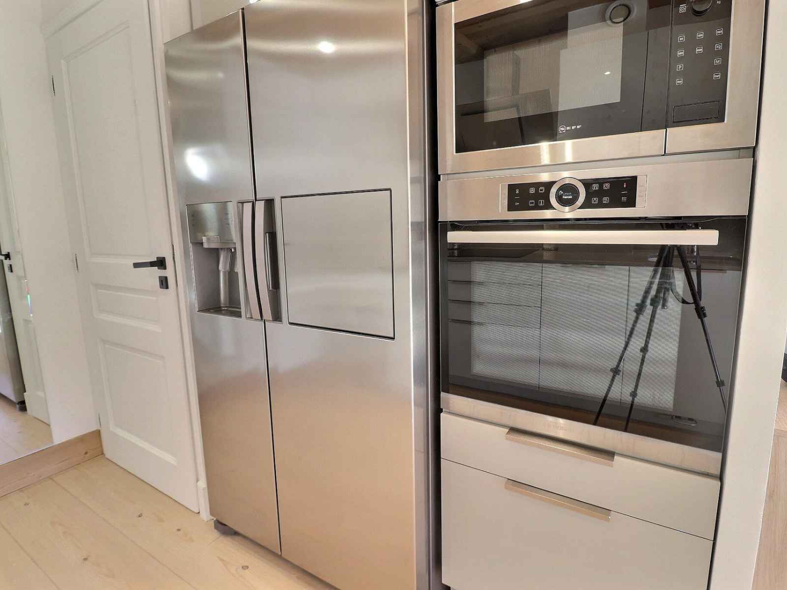 cuisine ouverte : four, micro-ondes, frigidaire américain, lave-vaisselle, 3 plaques à induction, hotte, cafetière