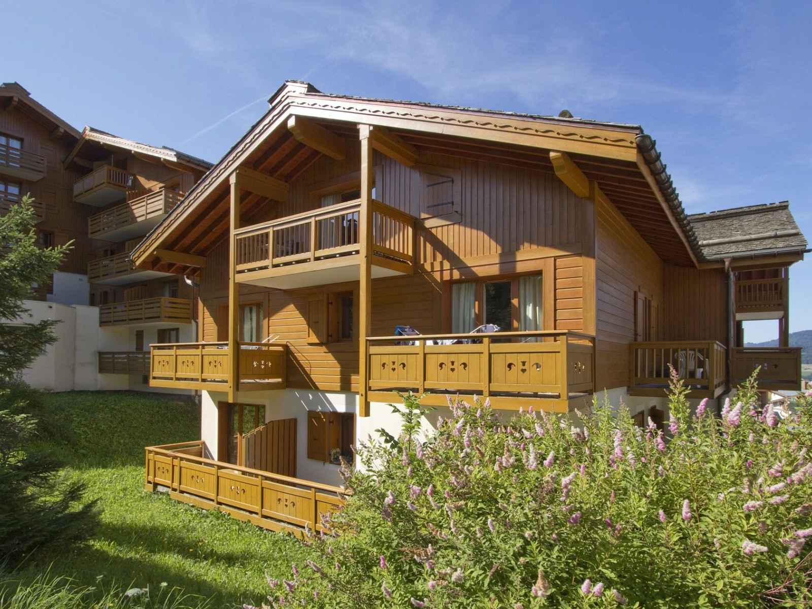 l’une de l’autre, les deux résidences proposent des appartements ouverts sur un balcon ou une terrasse, dotés d’un accès wifi et répartis dans deux grands chalets proposant chacun une piscine couverte chauffée et un sauna (avec participation).