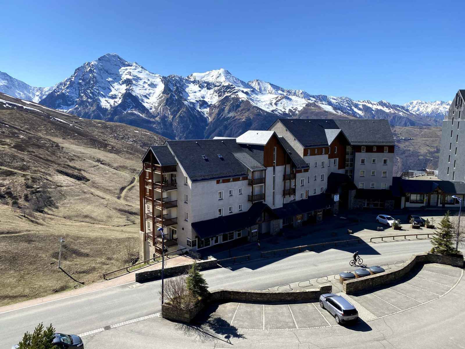 La résidence le royal peyragudes est une résidence construite dans le style pyrénéen avec des façades en pierre et en bois, située à l'entrée de la station de peyragudes versant peyresourde .face à la vallée, elle bénéficie d'une vue magnifique sur la chaîne de montagne et la vallée du louron.