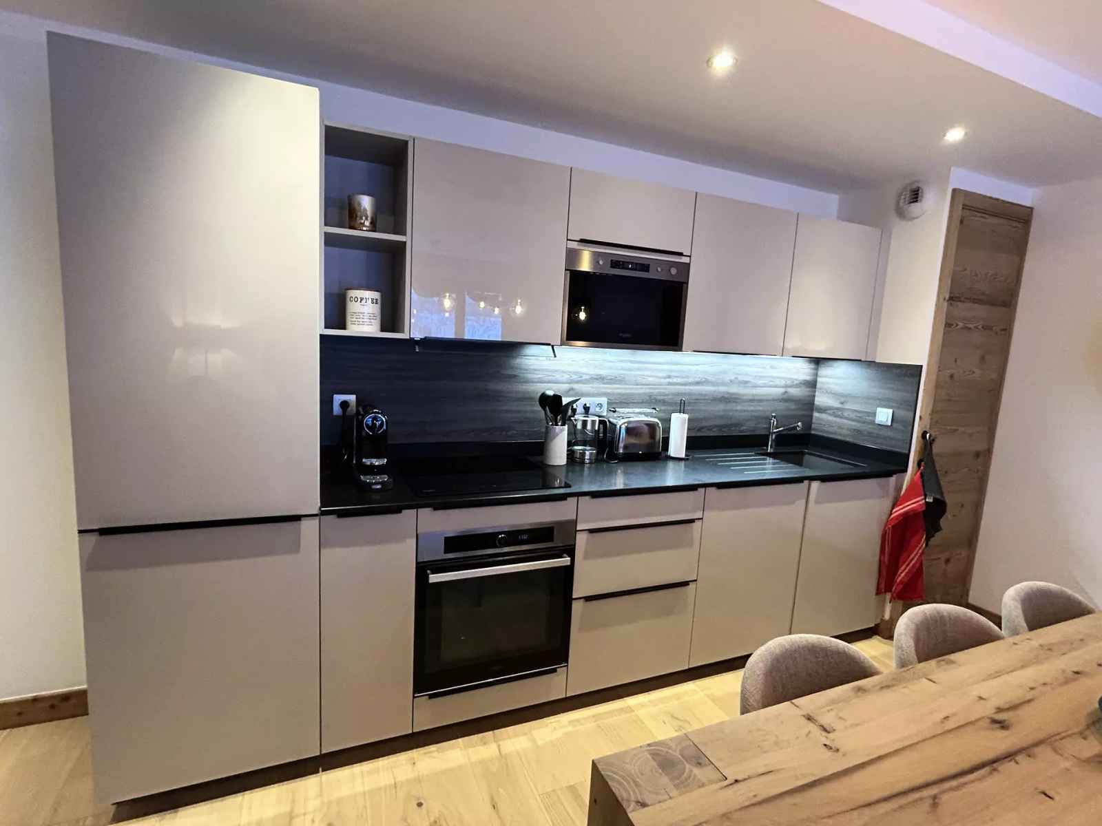 (réfrigérateur, lave-vaisselle, plaques vitrocéramiques, four, micro-ondes, bouilloire, grille-pain).