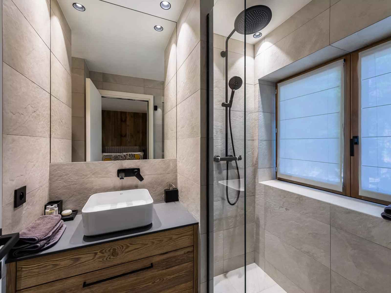 - Une chambre avec lit double en suite avec salle de bains avec douche et toilettes