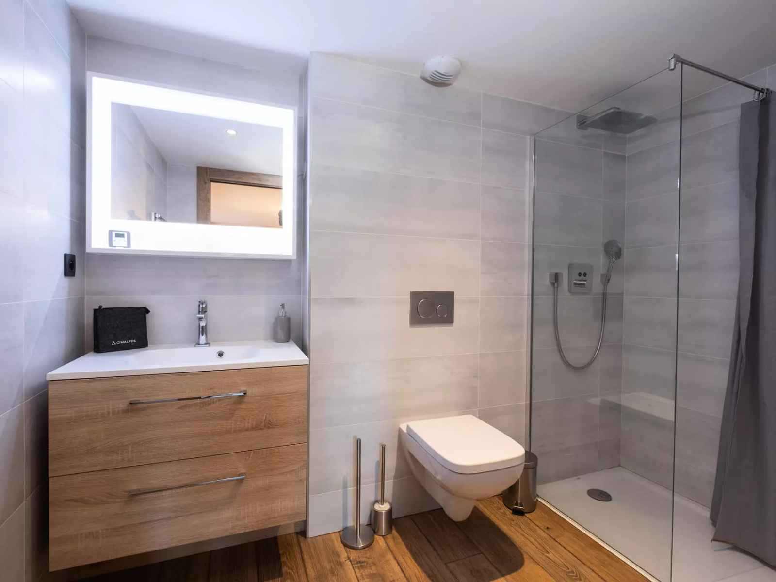 - Chambre parentale avec 1 lit double (160x200) en suite avec douche, toilettes, simple vasque et sèche-serviettes
