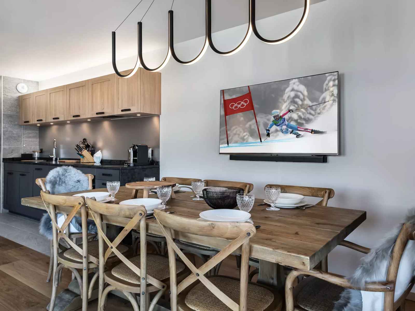 - cuisine ouverte entièrement équipée: lave vaisselle, lave linge, four, four microonde, frigo-congélateur,