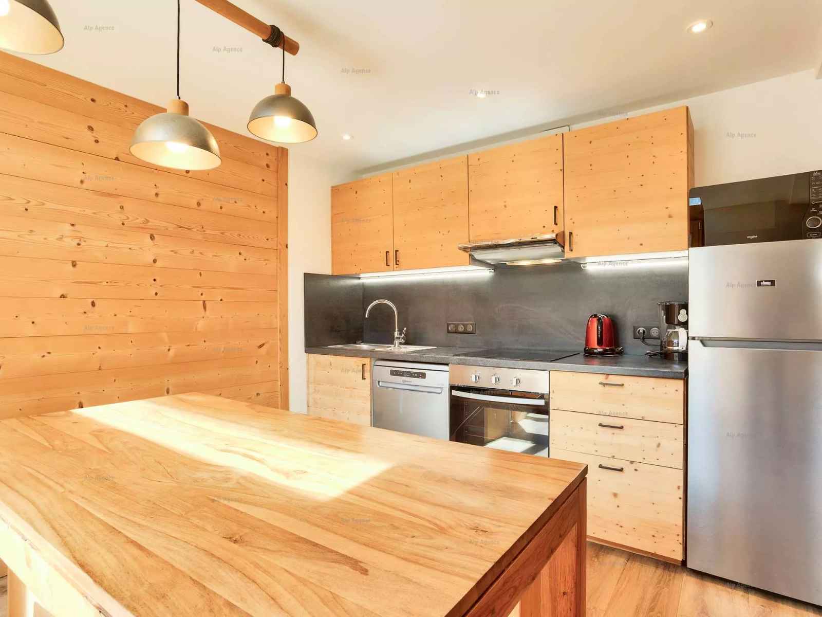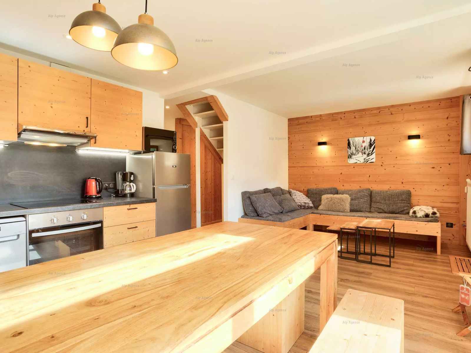 appt en duplex 9 pers, 63m² environ, séjour orienté sud avec balcon/terrasse vue sur les pistes - 1er étage avec ascenseur - niveau 1 : cuisine : 4 plaques vitrocéramiques, réfrigérateur/congélateur, four traditionnel, micro-ondes, lave-vaisselle -cafetière à filtre - séjour : coin repas, 1