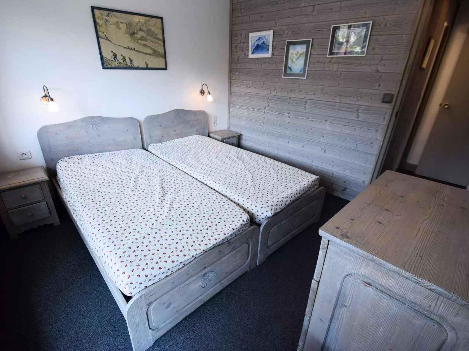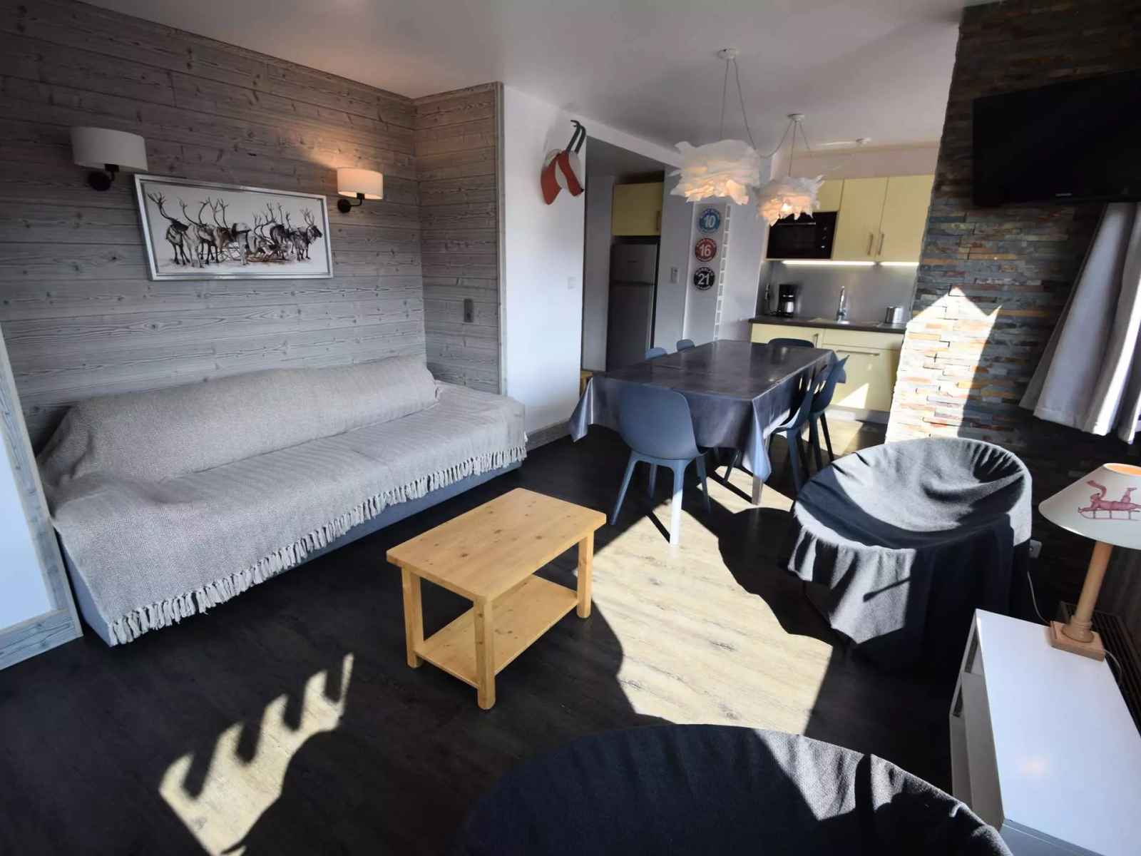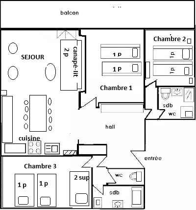 congélateur, lave-vaisselle, cafetière électrique filtre et Nespresso. Séjour : coin repas, coin salon avec 1 canapé-lit 2 pers. 160cm - TV - Chambre 1 : 2 lits 1 pers. (80cm) - Chambre 2 : 2 lits 1 pers. (90cm)- Chambre 3 : 2 lits superposés + 2 lits 1 pers. (80cm) 2 Salles de bains : 1 avec baignoire et 1 avec douche/wc inclus - 1 WC séparés. Literie : 8 couettes 1p et 1 couette 2p. Appartement non fumeur, animaux non admis. En option et en supplément: Ménage de fin de séjour, draps, serviettes, forfaits ski.