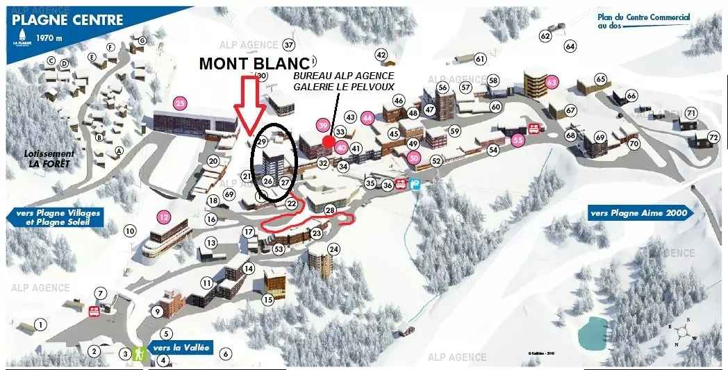 résidence située au pied des pistes, reliée aux commerces par galerie.