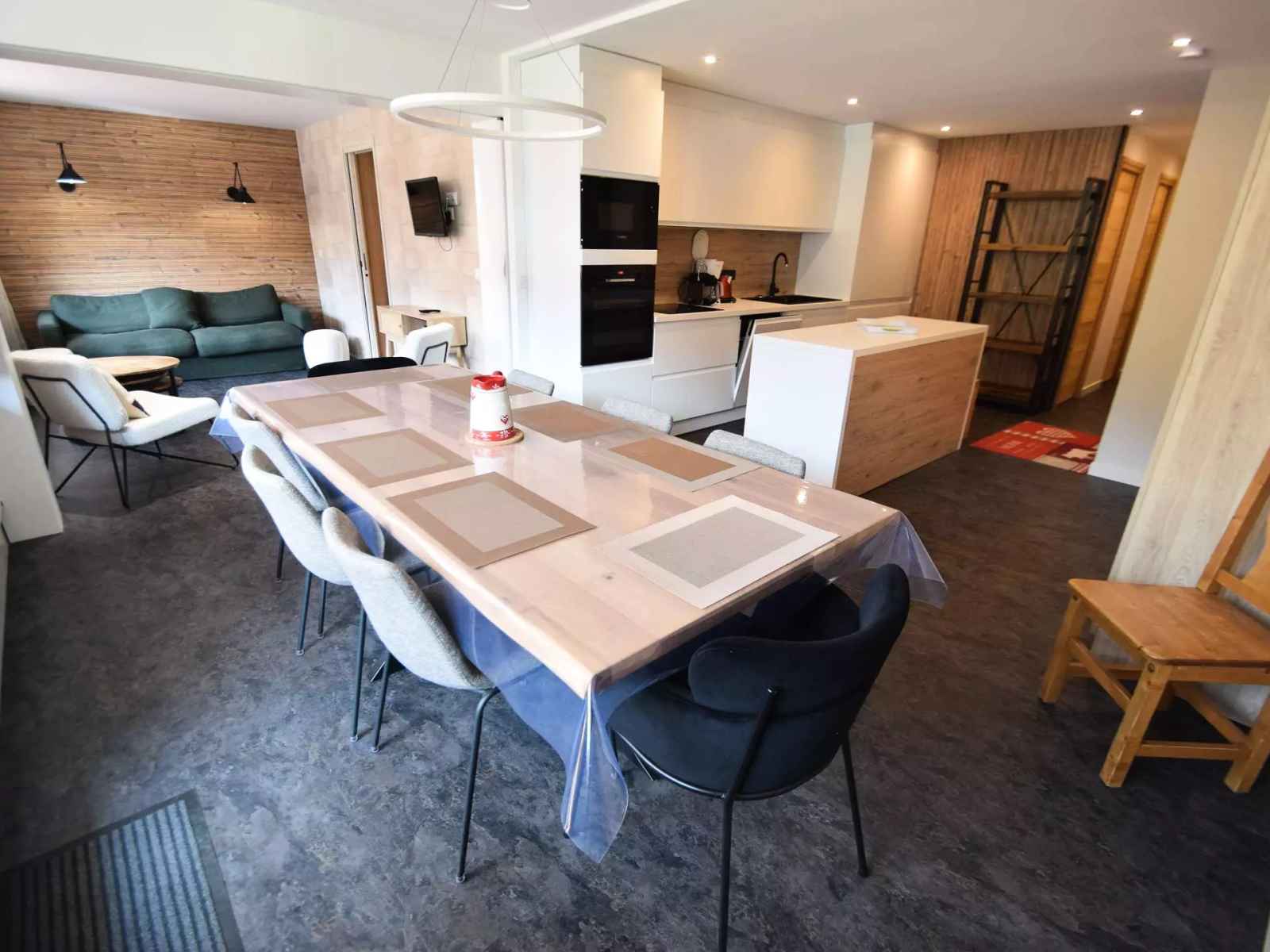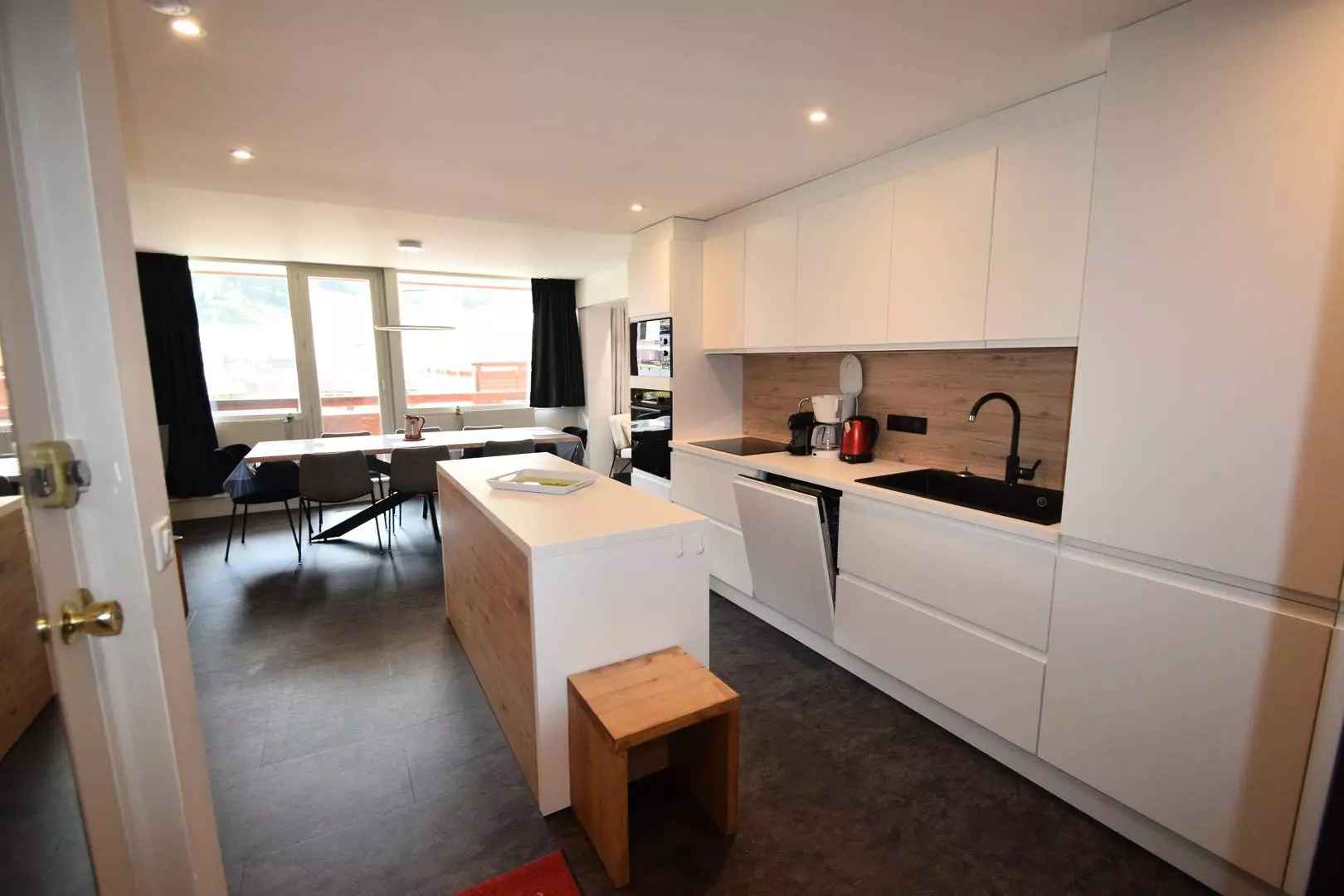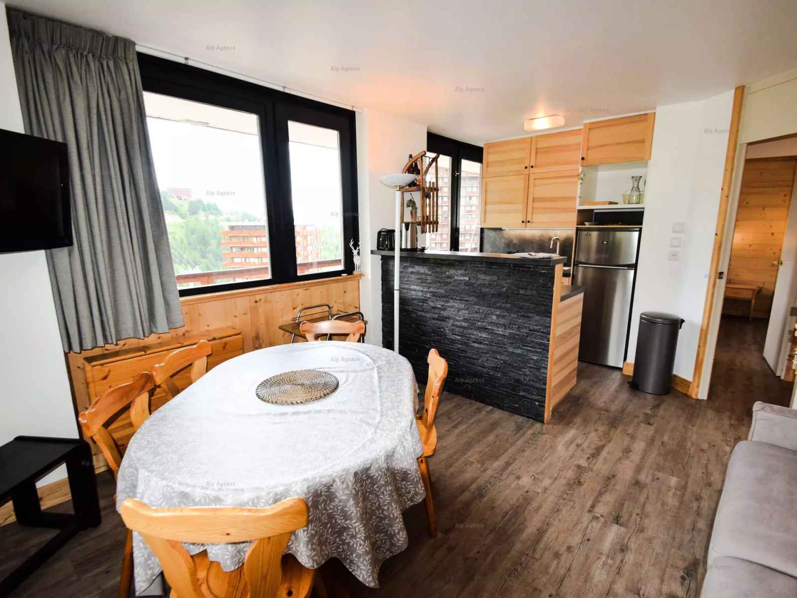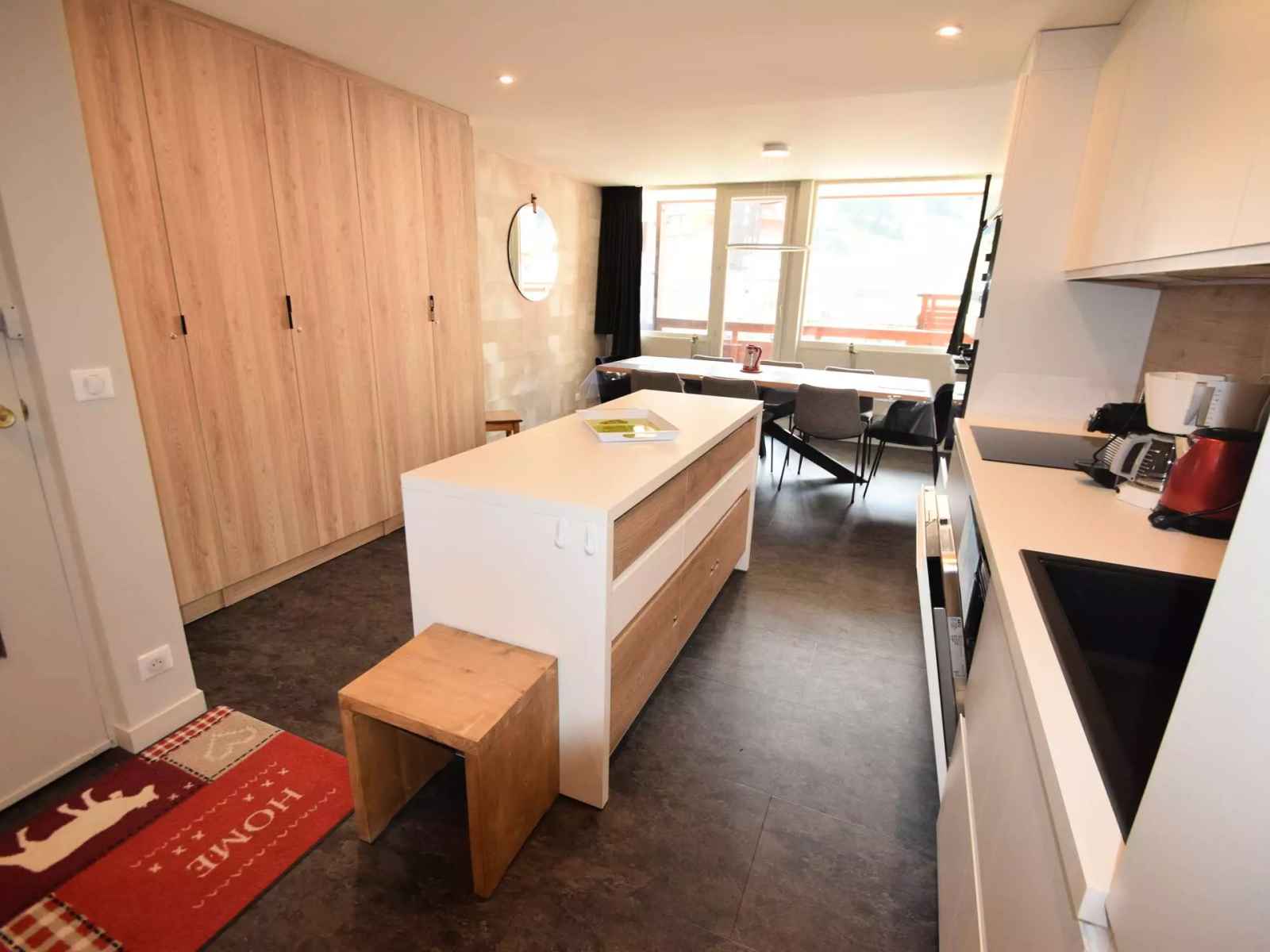 appt 4 pièces, 8 pers, 3 chambres et 2 salles de bain, environ 80m², exposé sud avec balcons, vue sur les pistes, au 1er étage sans ascenseur - cuisine ouverte : 4 plaques vitrocéramiques, réfrigérateur grand modèle, four multifonction, lave-vaisselle -