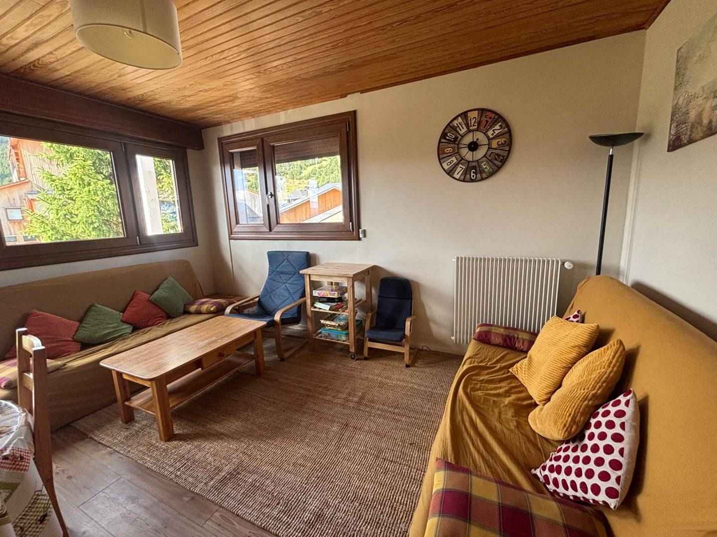 Coin repas et coin salon meublée d'un canapé convertible et d'une TV. Grande baie vitrée face aux pistes qui donne accès à un balcon plein Sud