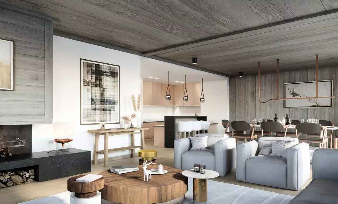 l'appartement stallion f01 de 143 m² est sur 3 étages avec ascenseur, avec un décor moderne et montagne. il accueille confortablement 9 personnes dans 3 chambres, dont une chambre enfants avec lits superposés. la pièce de vie traversante comprend cuisine équipée, espace repas, salon avec cheminée et accès