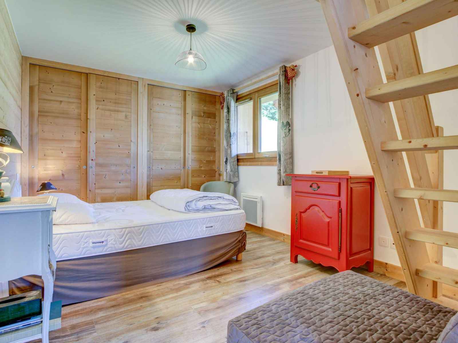 - une chambre avec 1 lit double (160x190cm) et un escalier d'accès à une petite chambre mansardée avec 2 lits simples (plafond bas)