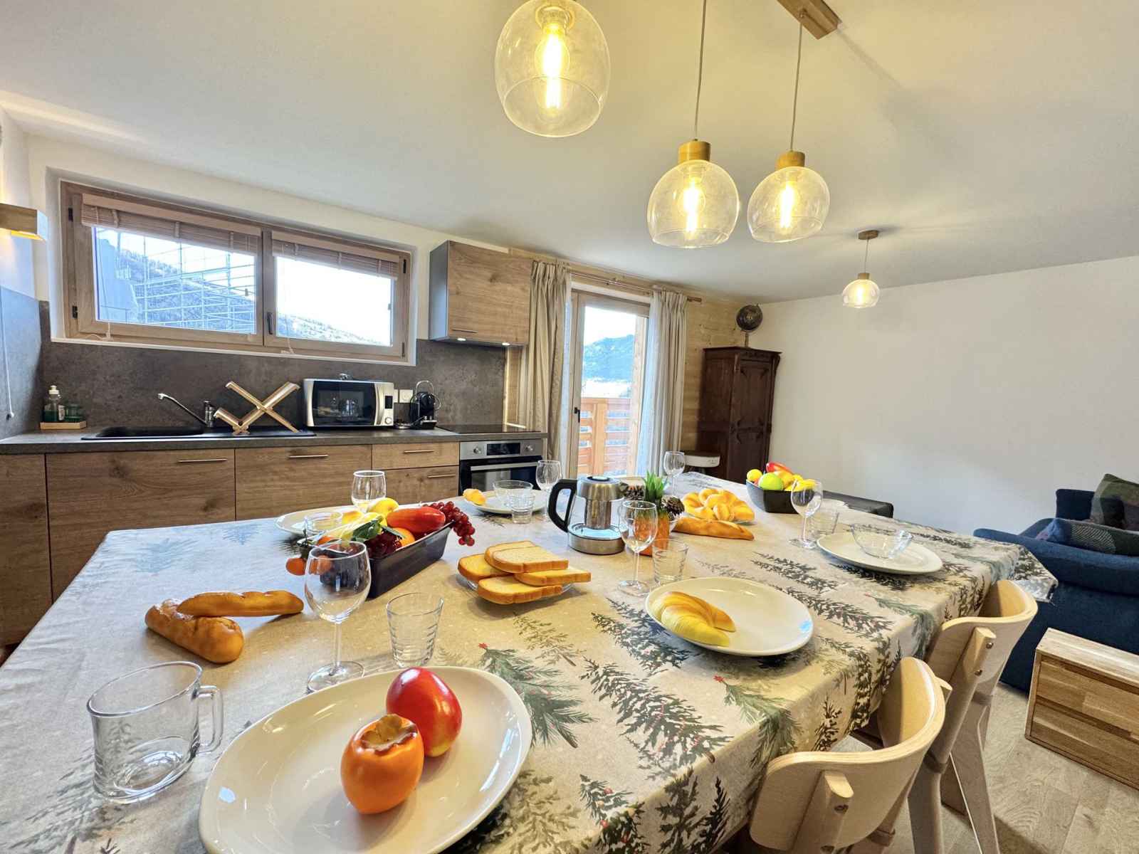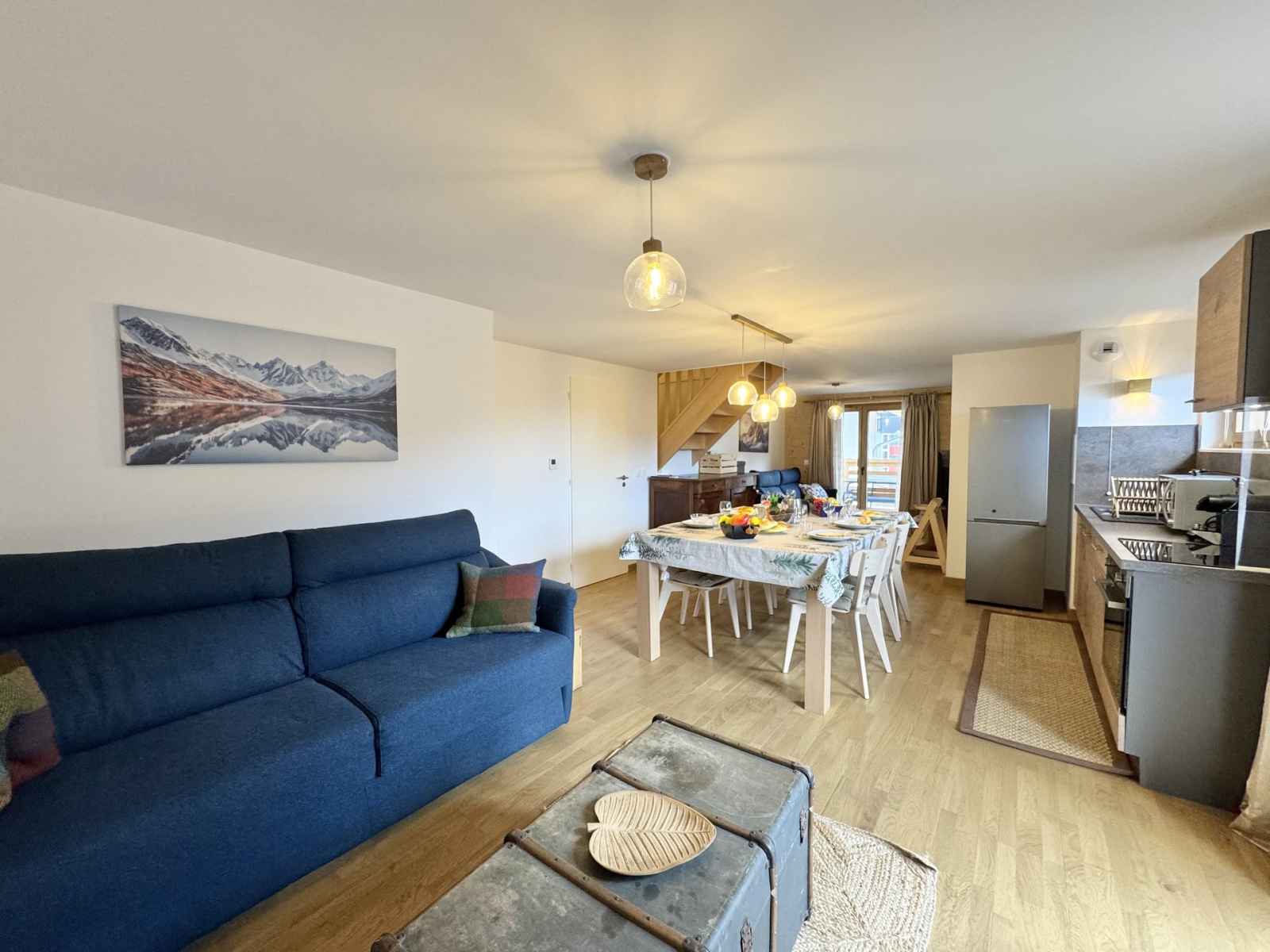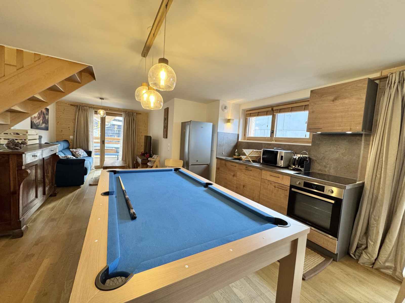 équipée d'un lit superposé et d'un accès à la terrasse, ainsi qu'une autre chambre avec trois lits simples en 90x200 pouvant être rapprochés pour creer un lit double (avec un surmatelas fourni). Le séjour dispose de deux canapés convertibles. L’appartement est entièrement équipé avec une bouilloire, une machine à café Nespresso, un lave-vaisselle, un four traditionnel, un frigo et des plaques de cuisson. Les points forts de cet appartement incluent un grand espace de vie traversant de lumière, une grande terrasse et un balcon traversant, offrant une vue imprenable sur les montagnes environnantes. De plus, une table transformable en billard apportera une touche ludique à vos soirées. L'appartement dispose également d'une place de parking privative, un atout précieux au centre de la station. Deux casiers à skis Un cadre idéal pour profiter des plaisirs de la montagne en toute sérénité ! Ménage de fin de séjour non compris et linge de maison en option (Pack draps et serviettes 16€/personne), nous consulter. Animaux admis. Toutes nos locations sont strictement NON-FUMEUR. Travaux en cours à proximité